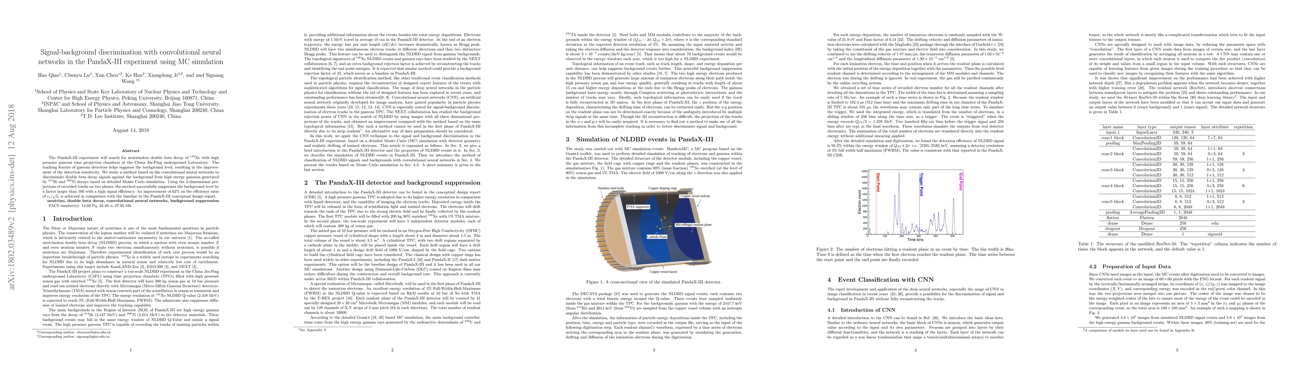 The PandaX-III experiment employs convolutional neural networks to enhance signal-background discrimination for neutrinoless double beta decay detection, leveraging detailed Monte Carlo simulations. The method, based on 2-D track projections, achieves a background suppression factor greater than 100 and improves the efficiency ratio by 62% compared to the baseline.