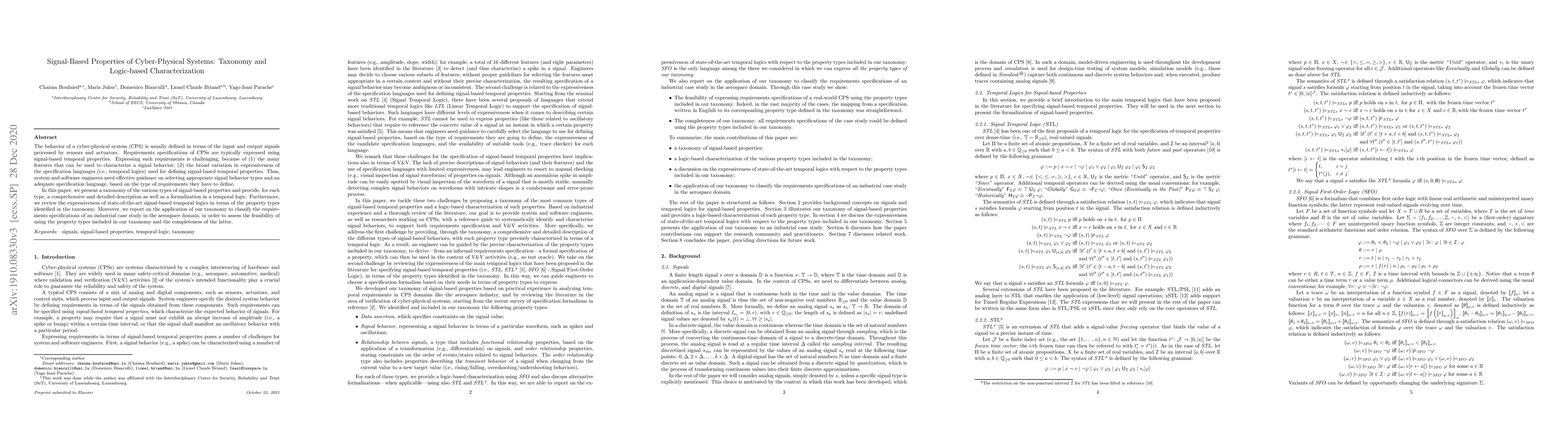A taxonomy of signal-based properties in cyber-physical systems is presented, categorizing 17 types with detailed descriptions and formalizations in temporal logic. This provides a framework for selecting suitable property types and specification languages to define requirements.