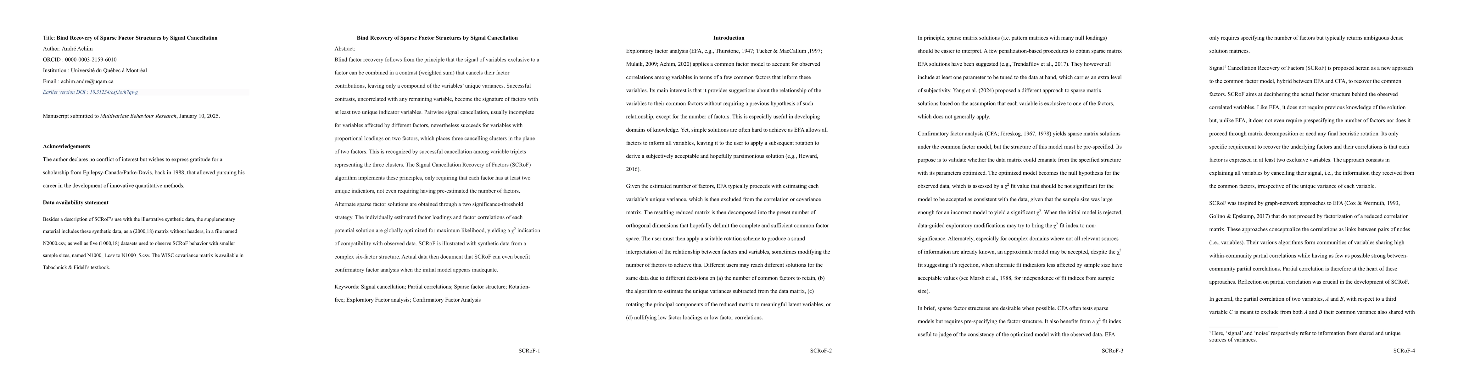 Signal cancellation provides a radically new and efficient approach to exploratory factor analysis, without matrix decomposition nor presetting the required number of factors. Its current implementation requires that each factor has at least two unique indicators. Its principle is that it is always possible to combine two indicator variables exclusive to the same factor with weights that cancel their common factor information. Successful combinations, consisting of nose only, are recognized by their null correlations with all remaining variables. The optimal combinations of multifactorial indicators, though, typically retain correlations with some other variables. Their signal, however, can be cancelled through combinations with unifactorial indicators of their contributing factors. The loadings are estimated from the relative signal cancellation weights of the variables involved along with their observed correlations. The factor correlations are obtained from those of their unifactorial indicators, corrected by their factor loadings. The method is illustrated with synthetic data from a complex six-factor structure that even includes two doublet factors. Another example using actual data documents that signal cancellation can rival confirmatory factor analysis.