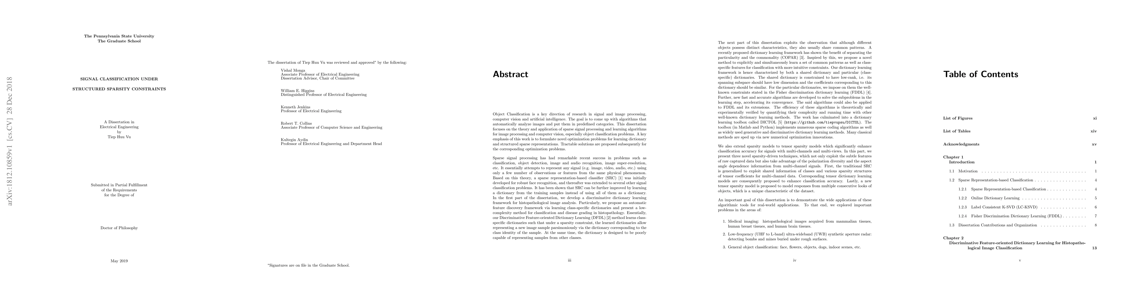 This dissertation explores sparse signal processing and learning algorithms for image classification, proposing novel optimization problems for dictionary learning and structured sparse representations. It demonstrates applications in medical imaging, UWB radar for bomb detection, and general object classification, showcasing the versatility of these algorithmic tools in real-world scenarios.