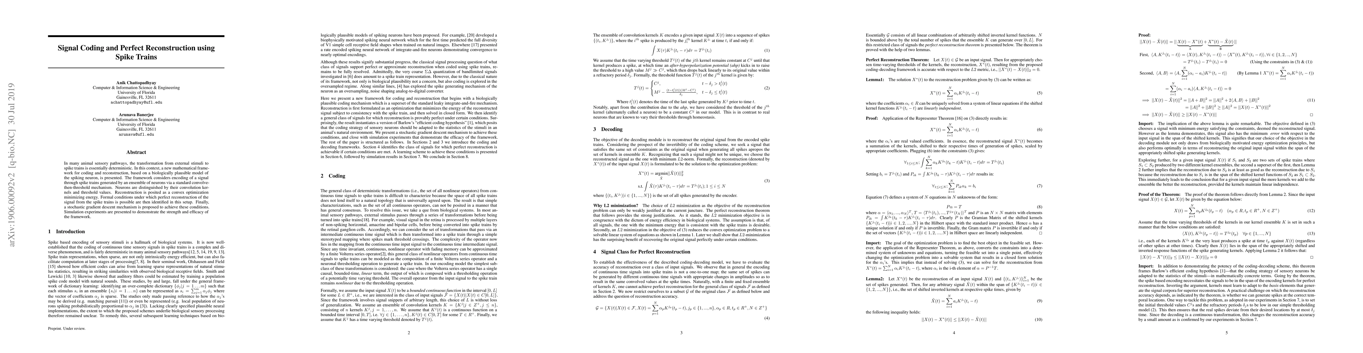 This paper introduces a mathematical framework for encoding and reconstructing signals using spike trains in neural pathways, based on a convolve-then-threshold model. It identifies conditions for perfect reconstruction via convex optimization and proposes a stochastic gradient descent method to achieve these conditions, validated through simulation experiments.