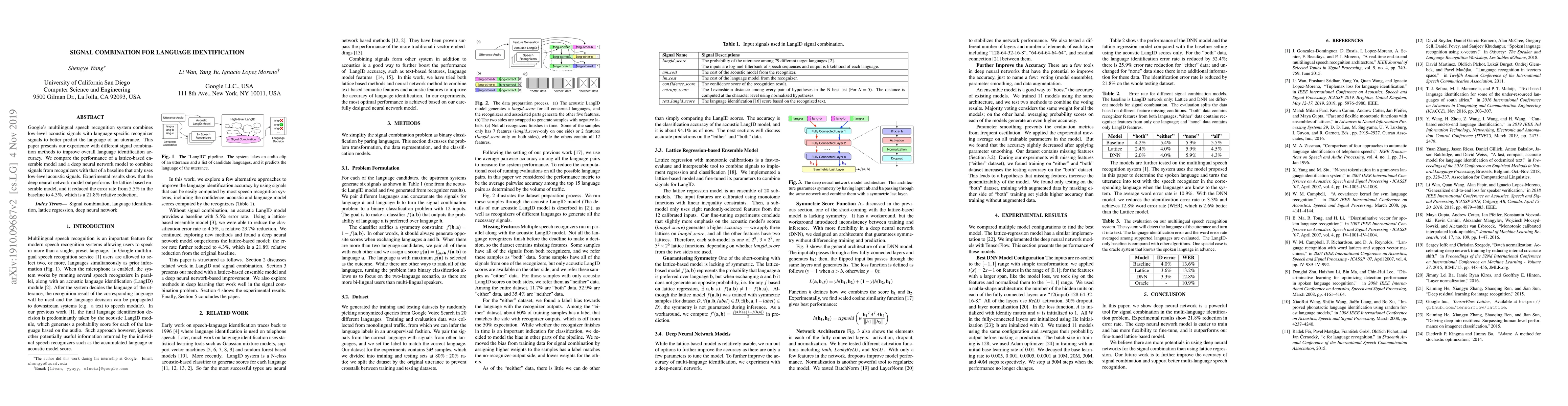 A deep neural network model outperforms a lattice-based ensemble model in combining low-level acoustic signals with language-specific recognizer signals to improve language identification accuracy, reducing error rates by 21.8%.