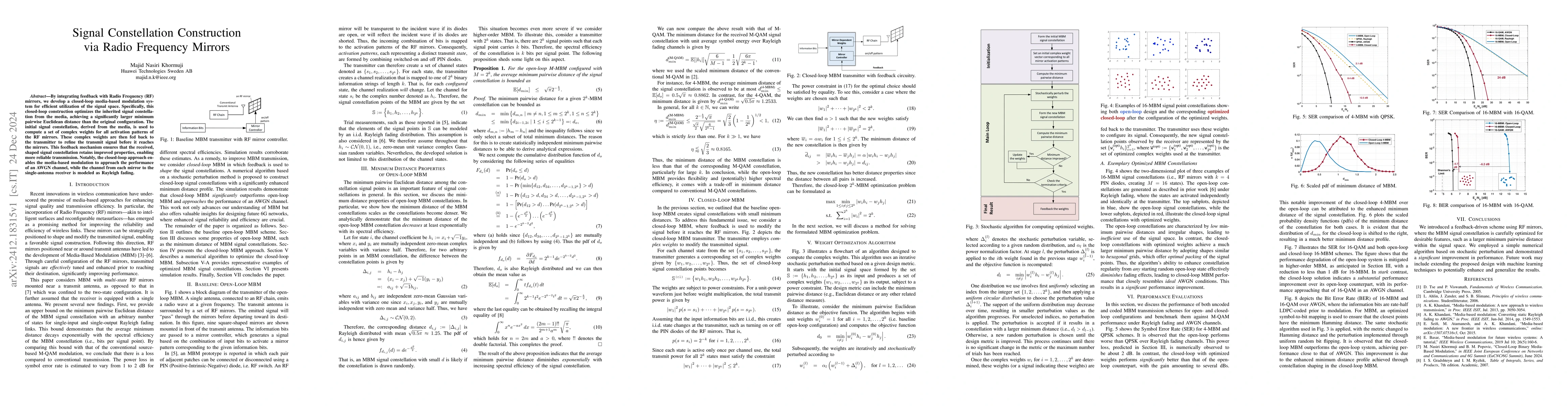 This research proposes a closed-loop modulation system using RF mirrors and feedback to optimize signal constellations, enhancing minimum Euclidean distance and transmission reliability. The method refines the initial signal constellation through complex weights, achieving near-AWGN channel performance despite Rayleigh fading in mirror-to-receiver channels.