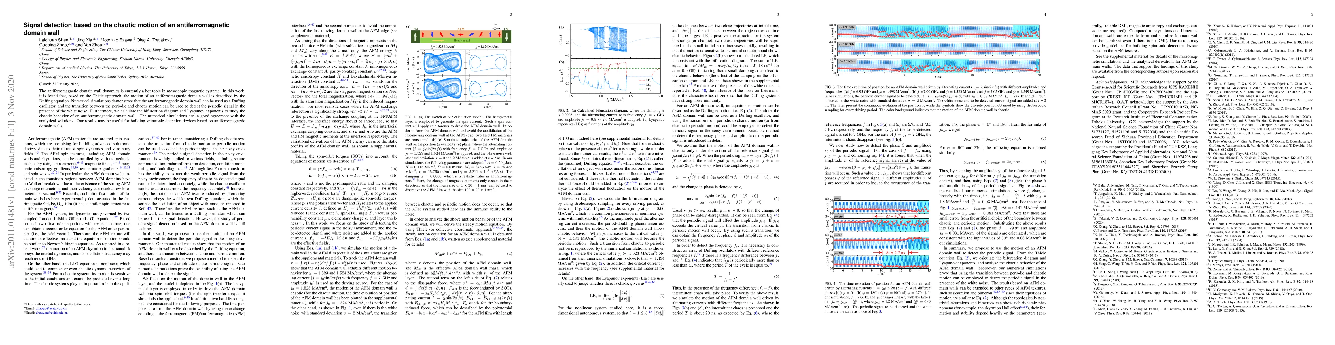 This research explores the chaotic dynamics of antiferromagnetic domain walls using the Duffing equation, demonstrating their potential as Duffing oscillators. The study shows that transitions between periodic and chaotic motion can detect periodic signals amidst white noise, with numerical simulations corroborating analytical solutions and suggesting applications in spintronic detection devices.