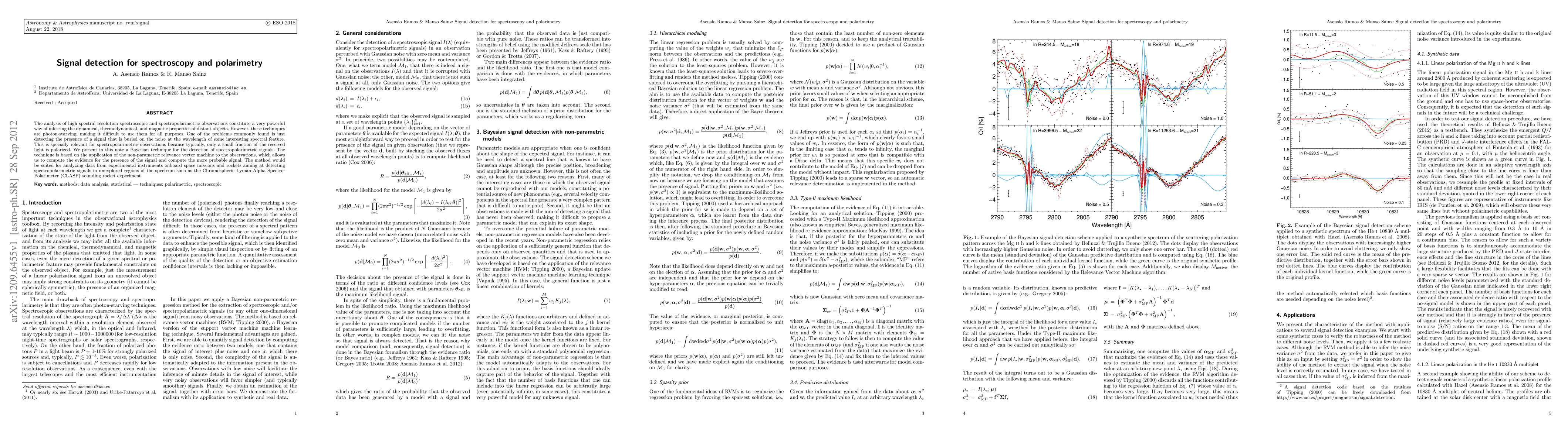 The analysis of high spectral resolution spectroscopic and spectropolarimetric observations constitute a very powerful way of inferring the dynamical, thermodynamical, and magnetic properties of distant objects. However, these techniques are photon-starving, making it difficult to use them for all purposes. One of the problems commonly found is just detecting the presence of a signal that is buried on the noise at the wavelength of some interesting spectral feature. This is specially relevant for spectropolarimetric observations because typically, only a small fraction of the received light is polarized. We present in this note a Bayesian technique for the detection of spectropolarimetric signals. The technique is based on the application of the non-parametric relevance vector machine to the observations, which allows us to compute the evidence for the presence of the signal and compute the more probable signal. The method would be suited for analyzing data from experimental instruments onboard space missions and rockets aiming at detecting spectropolarimetric signals in unexplored regions of the spectrum such as the Chromospheric Lyman-Alpha Spectro-Polarimeter (CLASP) sounding rocket experiment.