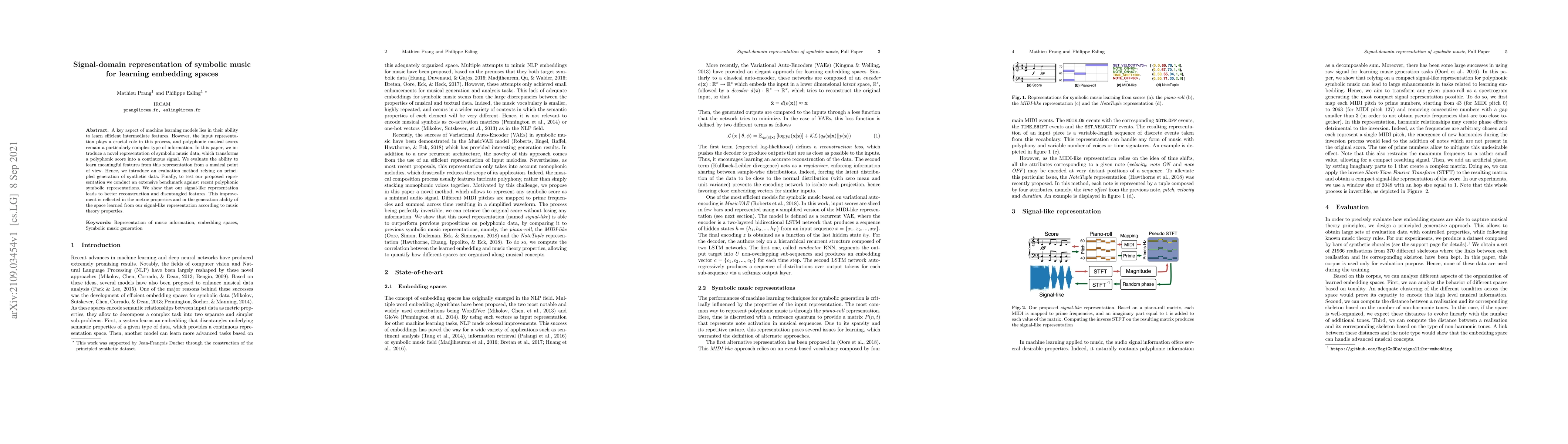 A key aspect of machine learning models lies in their ability to learn efficient intermediate features. However, the input representation plays a crucial role in this process, and polyphonic musical scores remain a particularly complex type of information. In this paper, we introduce a novel representation of symbolic music data, which transforms a polyphonic score into a continuous signal. We evaluate the ability to learn meaningful features from this representation from a musical point of view. Hence, we introduce an evaluation method relying on principled generation of synthetic data. Finally, to test our proposed representation we conduct an extensive benchmark against recent polyphonic symbolic representations. We show that our signal-like representation leads to better reconstruction and disentangled features. This improvement is reflected in the metric properties and in the generation ability of the space learned from our signal-like representation according to music theory properties.