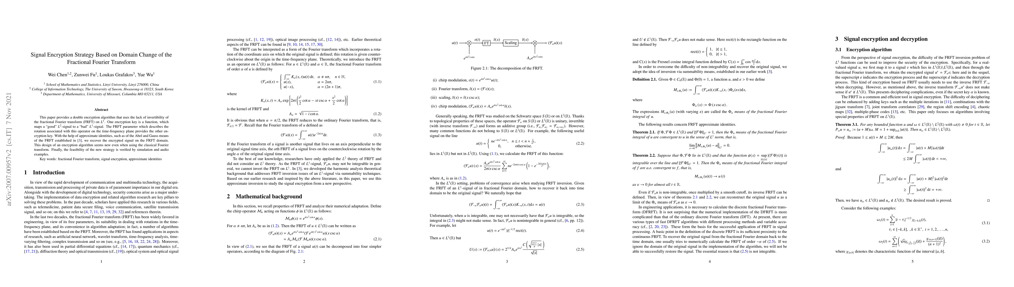 This paper introduces a novel double encryption strategy leveraging the fractional Fourier transform's non-invertibility on $L^{1}$, using one key as a function to distort signals and another as the FRFT parameter. The encrypted signal is recovered using approximate identities, and the method's effectiveness is demonstrated through simulations and audio examples.