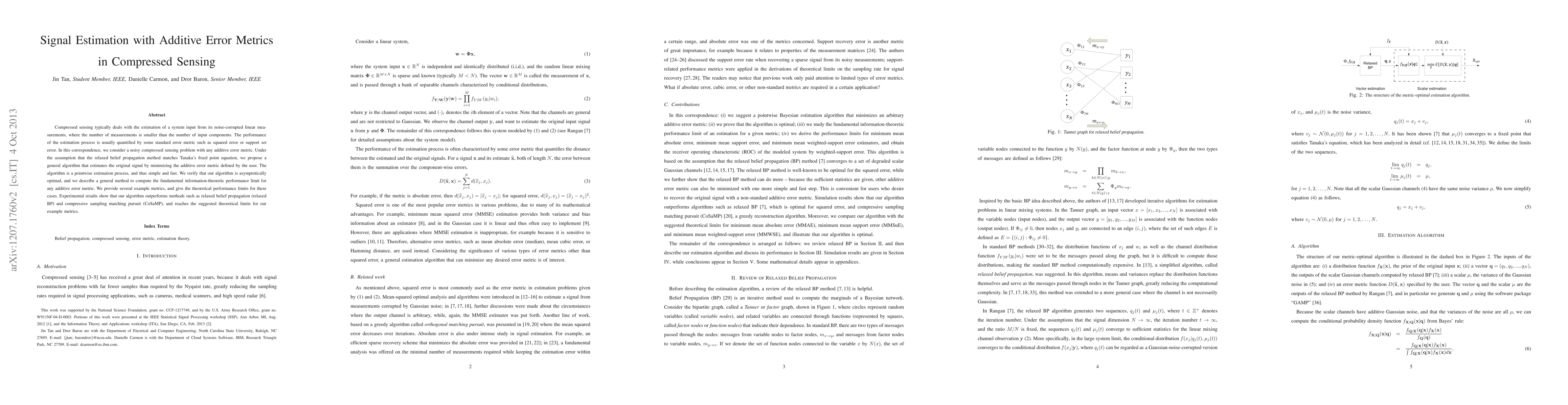 This research paper proposes an algorithm for signal estimation in compressed sensing with arbitrary error metrics, verifying it as optimal and providing theoretical performance limits for specific metrics.