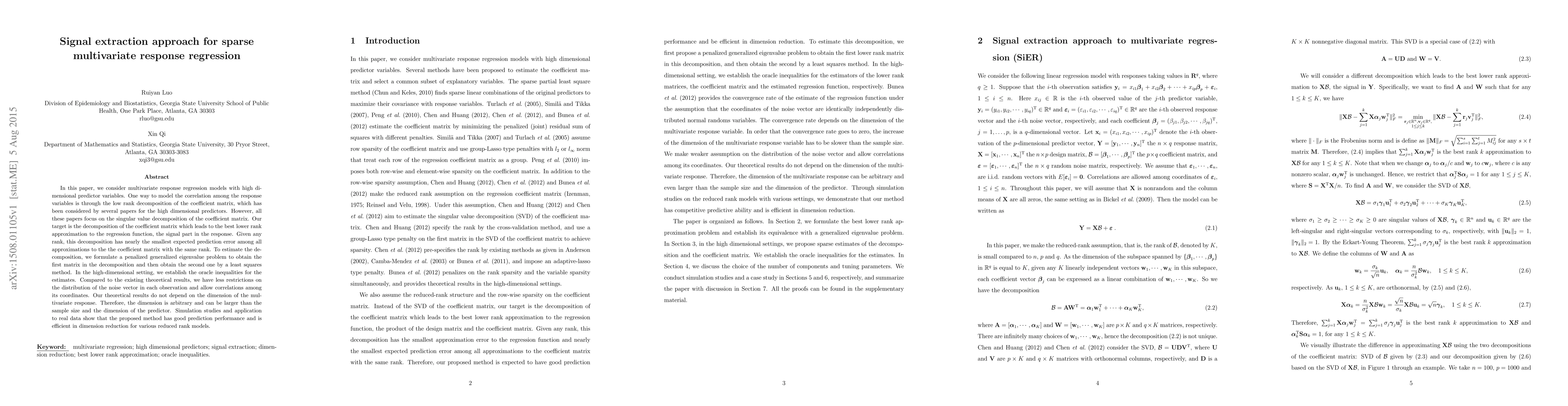 This paper proposes a novel signal extraction approach for sparse multivariate response regression, focusing on low rank decomposition of the coefficient matrix to achieve the best lower rank approximation. The method formulates a penalized generalized eigenvalue problem and uses least squares to estimate the decomposition, demonstrating good prediction performance and efficiency in high-dimensional settings.