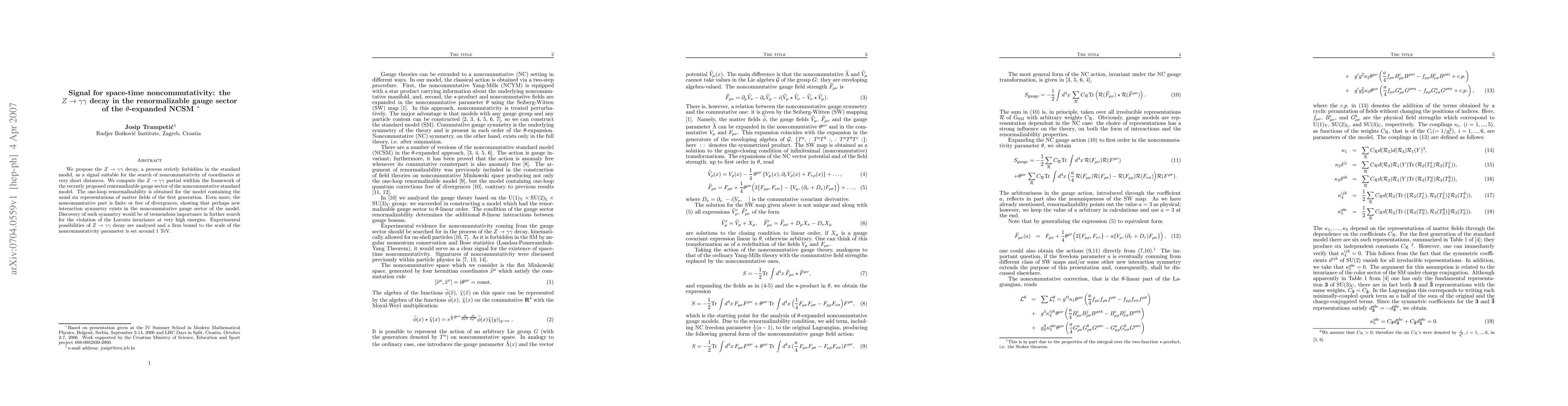 We propose the Z -> gamma gamma decay, a process strictly forbidden in the standard model, as a signal suitable for the search of noncommutativity of coordinates at very short distances. We compute the Z -> gamma gamma partial widthin the framework of the recently proposed renormalizable gauge sector of the noncommutative standard model. The one-loop renormalizability is obtained for the model containing the usual six representations of matter fields of the first generation. Even more, the noncommutative part is finite or free of divergences, showing that perhaps new interaction symmetry exists in the noncommutative gauge sector of the model. Discovery of such symmetry would be of tremendous importance in further search for the violation of the Lorentz invariance at very high energies. Experimental possibilities of Z -> gamma gamma decay are analyzed and a firm bound to the scale of the noncommutativity parameter is set around 1 TeV.