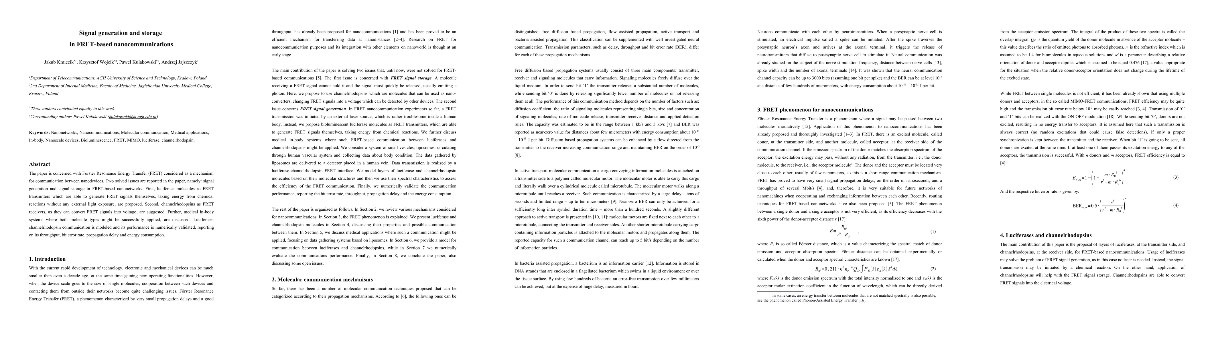 The paper is concerned with Forster Resonance Energy Transfer (FRET) considered as a mechanism for communication between nanodevices. Two solved issues are reported in the paper, namely: signal generation and signal storage in FRET-based nanonetworks. First, luciferase molecules as FRET transmitters which are able to generate FRET signals themselves, taking energy from chemical reactions without any external light exposure, are proposed. Second, channelrhodopsins as FRET receivers, as they can convert FRET signals into voltage, are suggested. Further, medical in-body systems where both molecule types might be successfully applied, are discussed. Luciferase-channelrhodopsin communication is modeled and its performance is numerically validated, reporting on its throughput, bit error rate, propagation delay and energy consumption.