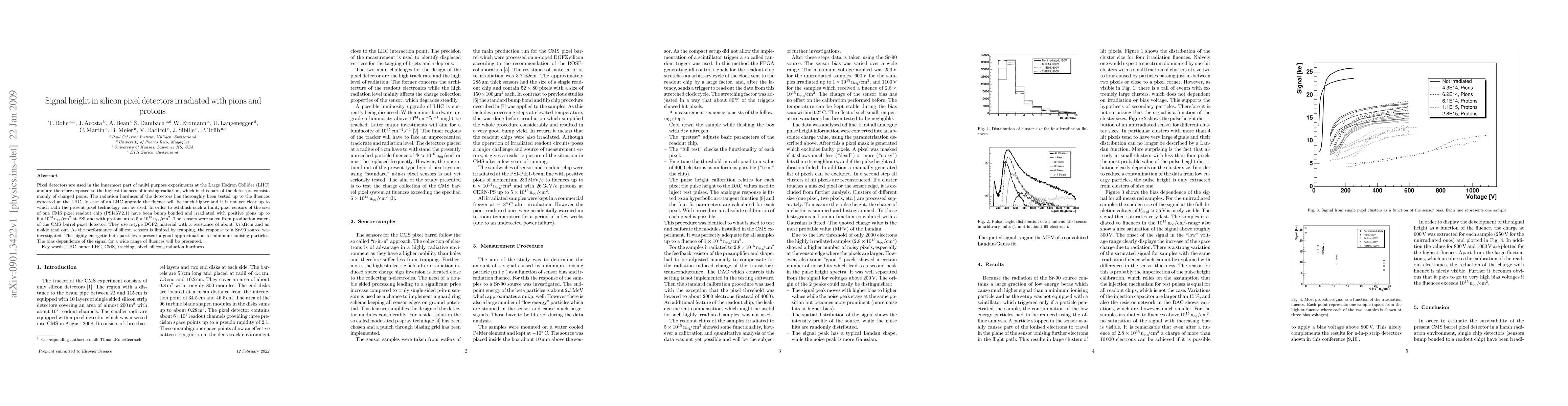 This paper investigates the signal height in silicon pixel detectors irradiated with pions and protons, focusing on their radiation hardness for potential LHC upgrades. The study examines the performance of CMS barrel pixel sensors under high fluences, presenting the bias dependence of signal response across various radiation levels.