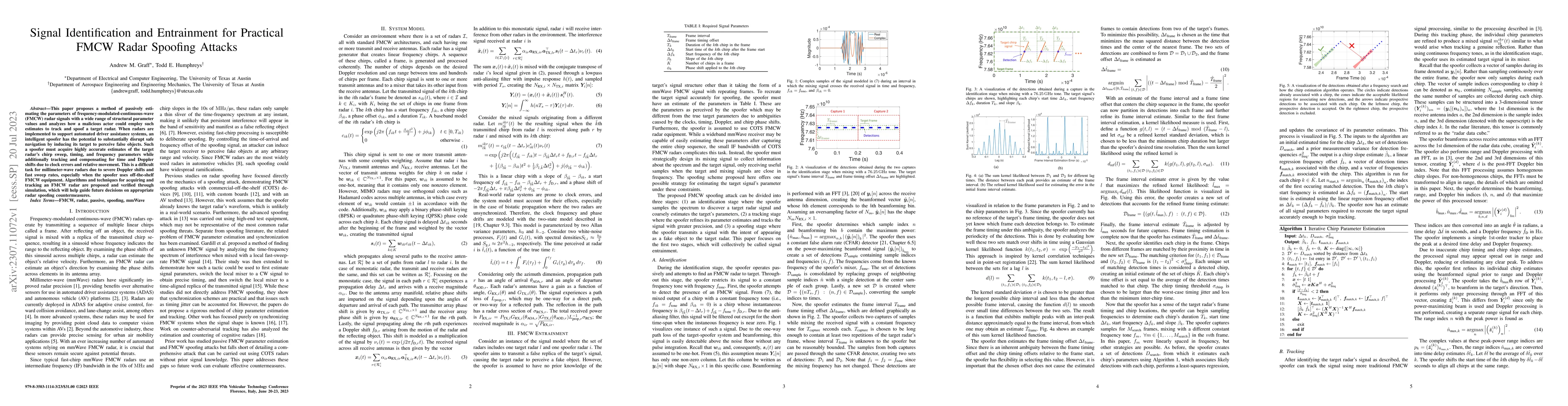 This paper proposes a method for passively estimating the parameters of FMCW radar signals to enable spoofing attacks, focusing on the challenges of tracking and compensating for time and Doppler shifts. Simulation results demonstrate the feasibility of these techniques, which can inform the development of countermeasures against radar spoofing.