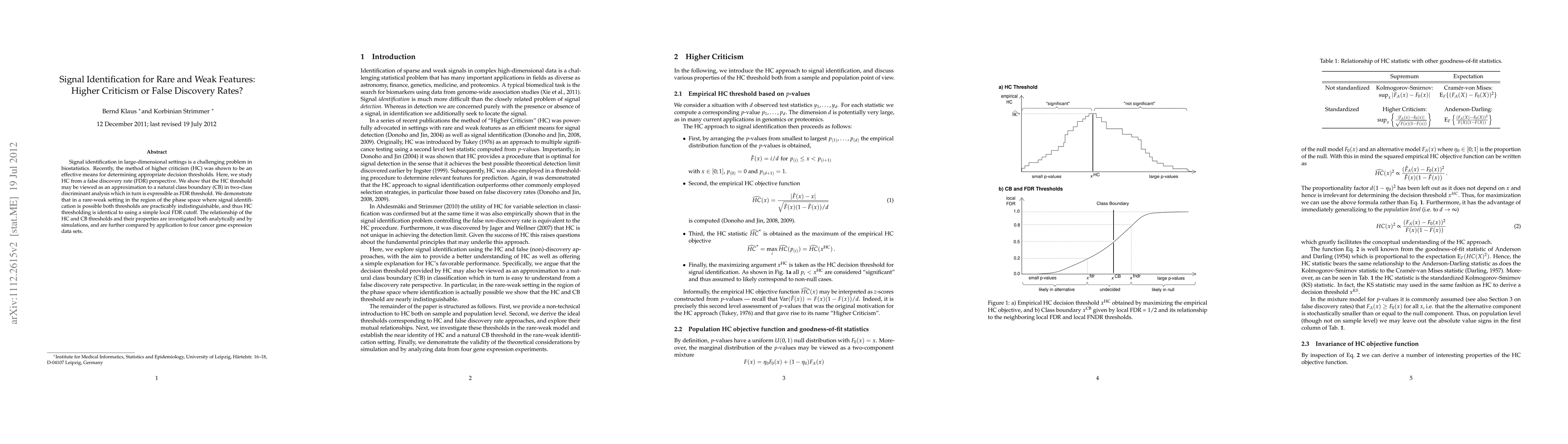 A study compares two methods for identifying signals in large datasets: Higher Criticism (HC) and False Discovery Rates (FDR). It finds that in rare-weak settings, HC thresholding is equivalent to simple local FDR cutoffs.