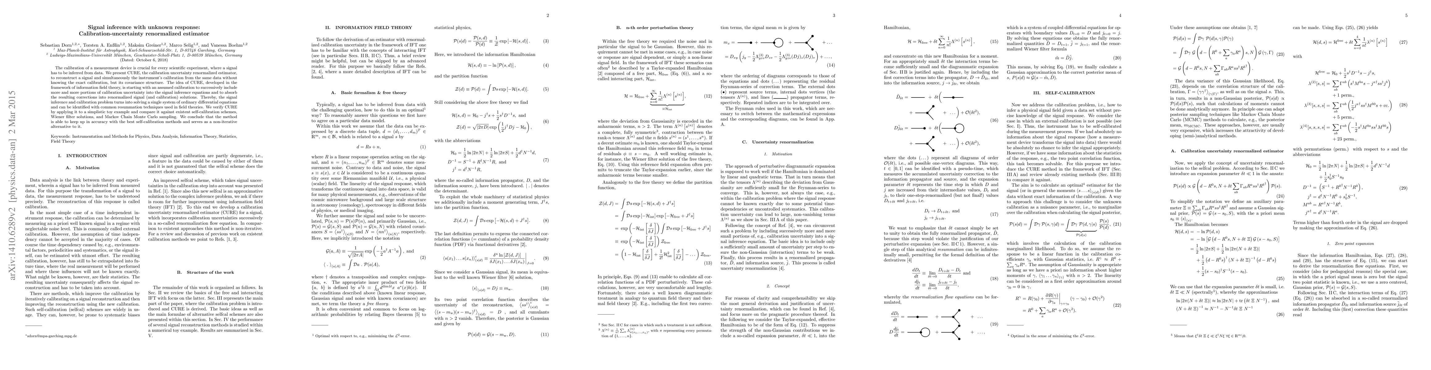 The calibration of a measurement device is crucial for every scientific experiment, where a signal has to be inferred from data. We present CURE, the calibration uncertainty renormalized estimator, to reconstruct a signal and simultaneously the instrument's calibration from the same data without knowing the exact calibration, but its covariance structure. The idea of CURE, developed in the framework of information field theory, is starting with an assumed calibration to successively include more and more portions of calibration uncertainty into the signal inference equations and to absorb the resulting corrections into renormalized signal (and calibration) solutions. Thereby, the signal inference and calibration problem turns into solving a single system of ordinary differential equations and can be identified with common resummation techniques used in field theories. We verify CURE by applying it to a simplistic toy example and compare it against existent self-calibration schemes, Wiener filter solutions, and Markov Chain Monte Carlo sampling. We conclude that the method is able to keep up in accuracy with the best self-calibration methods and serves as a non-iterative alternative to it.
