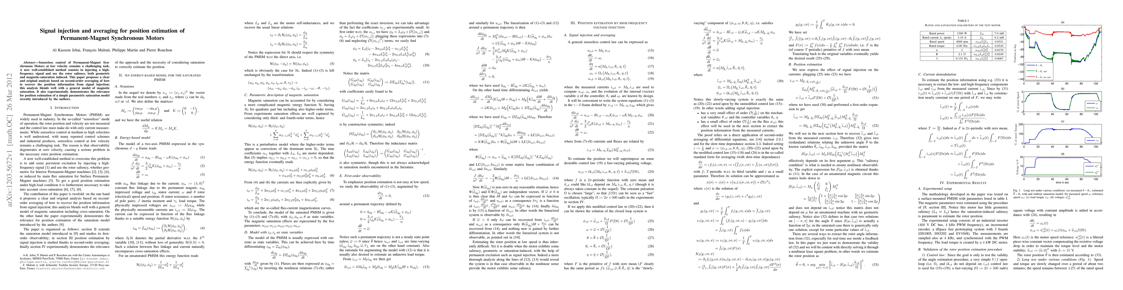 This paper proposes a method for sensorless control of Permanent-Magnet Synchronous Motors at low speeds by injecting high-frequency signals and using rotor saliency. It employs second-order averaging to analyze and recover position information, demonstrating the effectiveness of a recently introduced parametric saturation model.