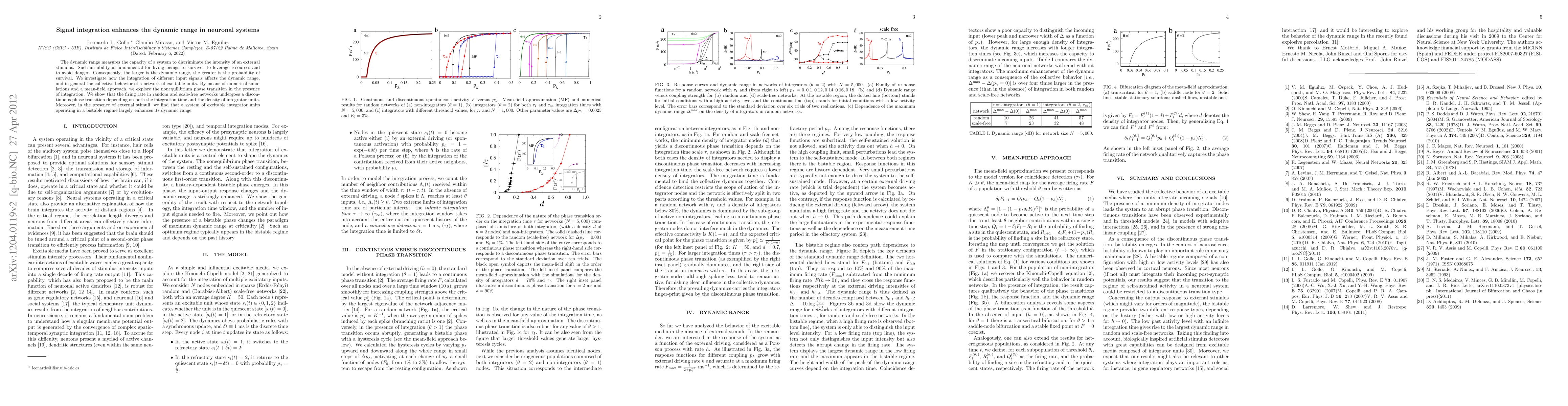 The dynamic range measures the capacity of a system to discriminate the intensity of an external stimulus. Such an ability is fundamental for living beings to survive: to leverage resources and to avoid danger. Consequently, the larger is the dynamic range, the greater is the probability of survival. We investigate how the integration of different input signals affects the dynamic range, and in general the collective behavior of a network of excitable units. By means of numerical simulations and a mean-field approach, we explore the nonequilibrium phase transition in the presence of integration. We show that the firing rate in random and scale-free networks undergoes a discontinuous phase transition depending on both the integration time and the density of integrator units. Moreover, in the presence of external stimuli, we find that a system of excitable integrator units operating in a bistable regime largely enhances its dynamic range.