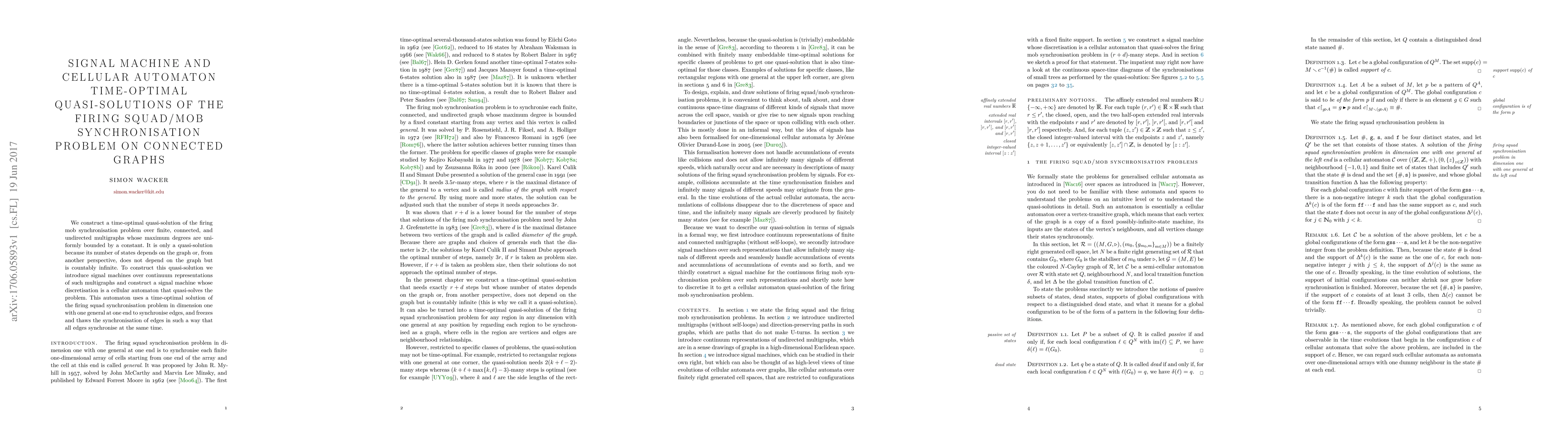 We construct a time-optimal quasi-solution of the firing mob synchronisation problem over finite, connected, and undirected multigraphs whose maximum degrees are uniformly bounded by a constant. It is only a quasi-solution because its number of states depends on the graph or, from another perspective, does not depend on the graph but is countably infinite. To construct this quasi-solution we introduce signal machines over continuum representations of such multigraphs and construct a signal machine whose discretisation is a cellular automaton that quasi-solves the problem. This automaton uses a time-optimal solution of the firing squad synchronisation problem in dimension one with one general at one end to synchronise edges, and freezes and thaws the synchronisation of edges in such a way that all edges synchronise at the same time.