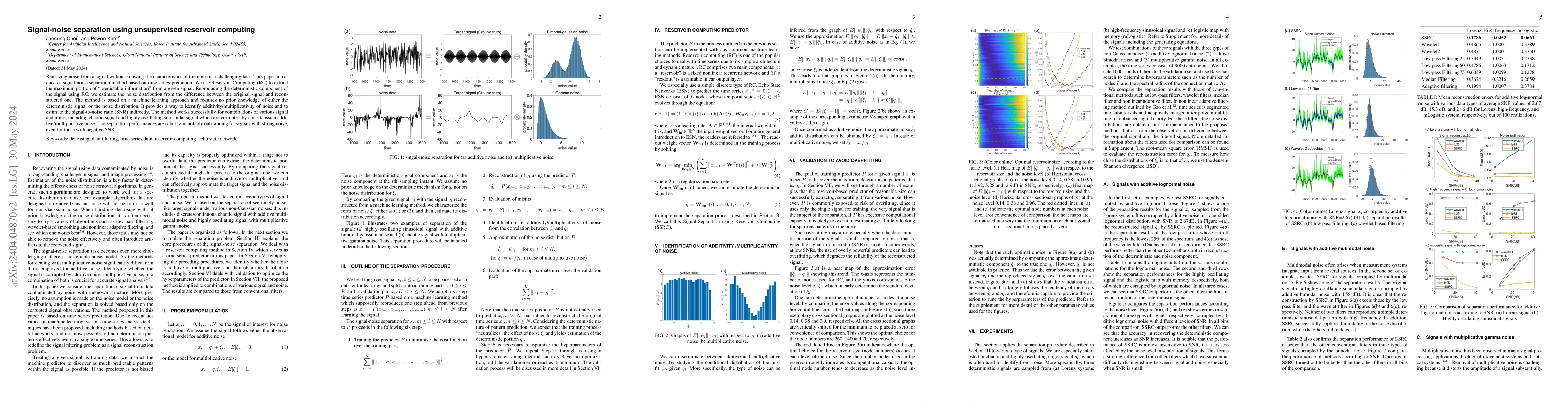 Removing noise from a signal without knowing the characteristics of the noise is a challenging task. This paper introduces a signal-noise separation method based on time series prediction. We use Reservoir Computing (RC) to extract the maximum portion of "predictable information" from a given signal. Reproducing the deterministic component of the signal using RC, we estimate the noise distribution from the difference between the original signal and reconstructed one. The method is based on a machine learning approach and requires no prior knowledge of either the deterministic signal or the noise distribution. It provides a way to identify additivity/multiplicativity of noise and to estimate the signal-to-noise ratio (SNR) indirectly. The method works successfully for combinations of various signal and noise, including chaotic signal and highly oscillating sinusoidal signal which are corrupted by non-Gaussian additive/ multiplicative noise. The separation performances are robust and notably outstanding for signals with strong noise, even for those with negative SNR.