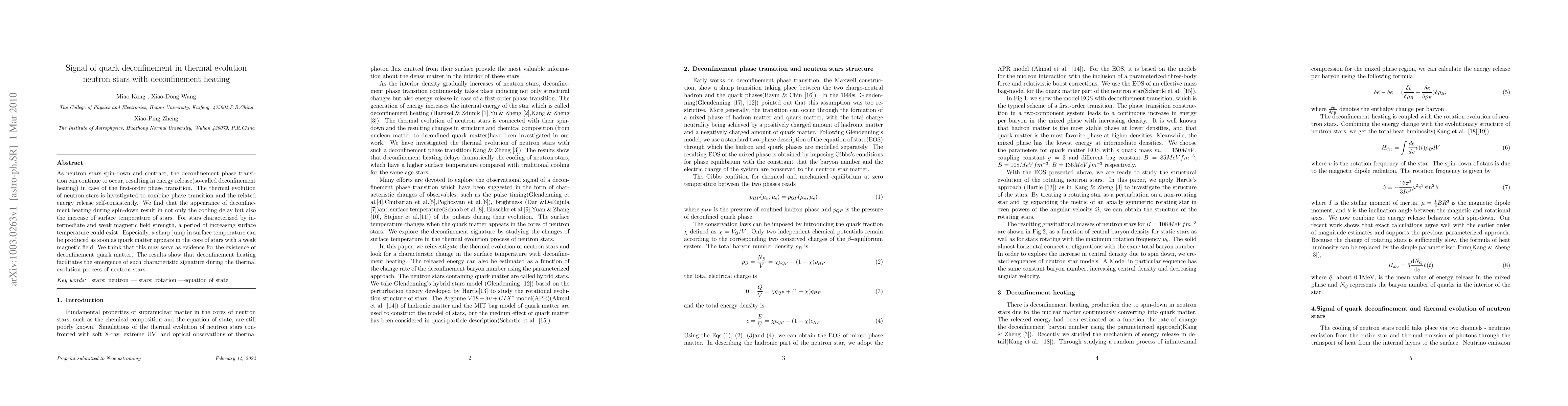 This research investigates neutron stars' thermal evolution, finding that deconfinement heating due to phase transitions can delay cooling and increase surface temperatures. A sharp temperature jump in stars with weak magnetic fields may indicate the presence of deconfinement quark matter.