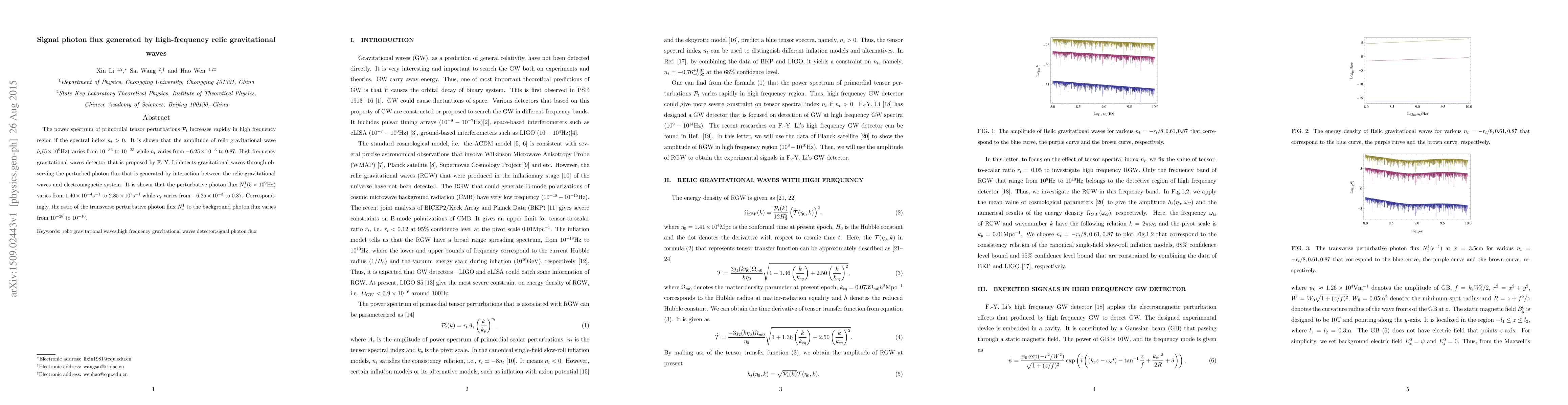 This paper investigates the signal photon flux generated by high-frequency relic gravitational waves, showing that the amplitude varies significantly with spectral index. A proposed high-frequency detector can observe perturbed photon flux generated by these interactions, with a ratio to background photon flux ranging from $10^{-28}$ to $10^{-16}$.
