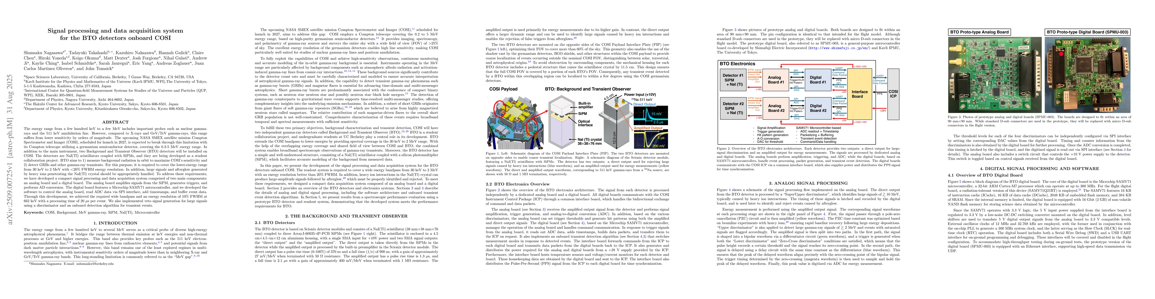 The energy range from a few hundred keV to a few MeV includes important probes such as nuclear gamma-rays and the 511 keV annihilation line. However, compared to X-rays and GeV/TeV gamma-rays, this range suffers from lower sensitivity by orders of magnitude. The upcoming NASA SMEX satellite mission Compton Spectrometer and Imager (COSI), scheduled for launch in 2027, is expected to break through this limitation with its Compton telescope utilizing a germanium semiconductor detector, covering the 0.2-5 MeV energy range. In addition to the main instrument, two Background and Transient Observer (BTO) detectors will be installed on COSI. The detectors are NaI(Tl) scintillators coupled with SiPMs, and they are being developed as a student collaboration project. BTO aims to 1) measure background radiation in orbit to maximize COSI's sensitivity and 2) detect GRBs and other gamma-ray transients. For this purpose, it is required to cover the lower-energy range from 30 keV to 2 MeV with < 20% FWHM energy resolution. In addition, large signals and afterglow generated by heavy ions penetrating the NaI(Tl) crystal should be appropriately handled. To address these requirements, we have developed a compact signal processing and data acquisition system comprised of two main components: an analog board and a digital board. The analog board amplifies signals from the SiPM, generates triggers, and performs AD conversion. The digital board features a Microchip SAMV71 microcontroller, and we developed the software to control the analog board, read ADC data via SPI interface, add timestamps, and buffer event data. Through this development, we achieved the required wide bandpass and an energy resolution of 10% FWHM at 662 keV with a processing time of 20 us per event. We also implemented veto signal generation for large signals using a discriminator and an onboard detection algorithm for transient events.