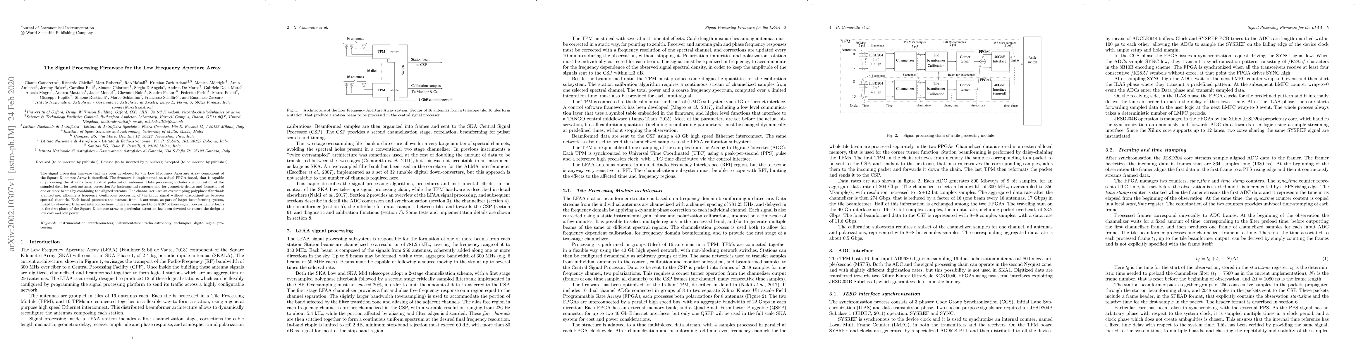 This paper describes a signal processing firmware for the Low Frequency Aperture Array of the Square Kilometre Array, implemented on a dual FPGA board. It processes data from 16 dual polarization antennas, employing an oversampling polyphase filterbank for continuous frequency processing and forming beams via combined streams.