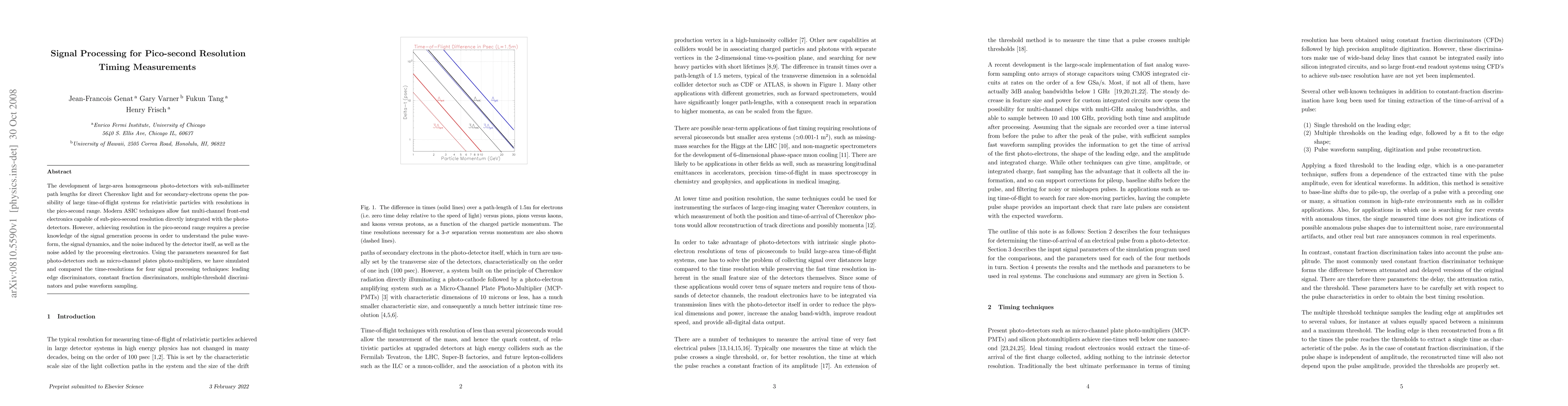 The development of large-area homogeneous photo-detectors with sub-millimeter path lengths for direct Cherenkov light and for secondary-electrons opens the possibility of large time-of-flight systems for relativistic particles with resolutions in the pico-second range. Modern ASIC techniques allow fast multi-channel front-end electronics capable of sub-pico-second resolution directly integrated with the photo-detectors. However, achieving resolution in the pico-second range requires a precise knowledge of the signal generation process in order to understand the pulse waveform, the signal dynamics, and the noise induced by the detector itself, as well as the noise added by the processing electronics. Using the parameters measured for fast photo-detectors such as micro-channel plates photo-multipliers, we have simulated and compared the time-resolutions for four signal processing techniques: leading edge discriminators, constant fraction discriminators, multiple-threshold discriminators and pulse waveform sampling.