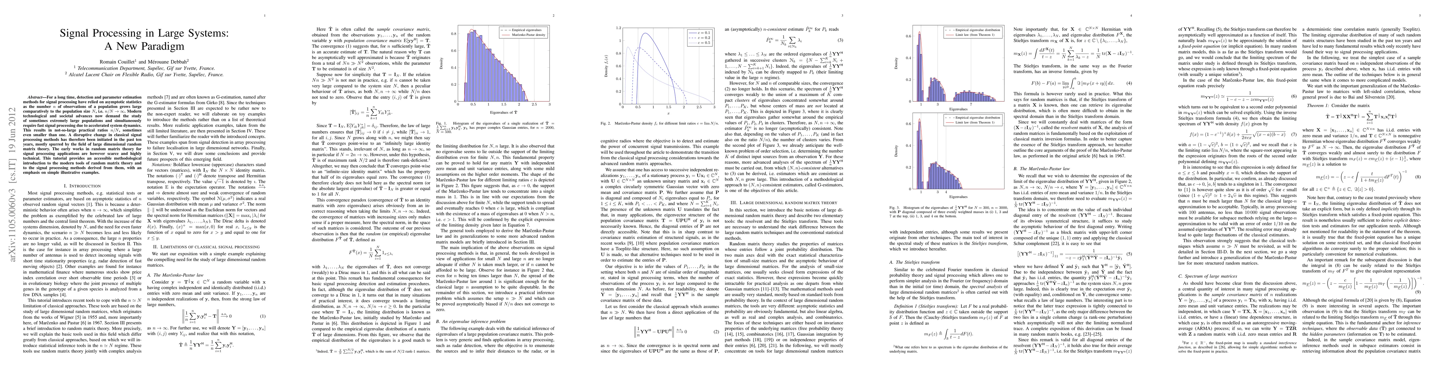 For a long time, detection and parameter estimation methods for signal processing have relied on asymptotic statistics as the number $n$ of observations of a population grows large comparatively to the population size $N$, i.e. $n/N\to \infty$. Modern technological and societal advances now demand the study of sometimes extremely large populations and simultaneously require fast signal processing due to accelerated system dynamics. This results in not-so-large practical ratios $n/N$, sometimes even smaller than one. A disruptive change in classical signal processing methods has therefore been initiated in the past ten years, mostly spurred by the field of large dimensional random matrix theory. The early works in random matrix theory for signal processing applications are however scarce and highly technical. This tutorial provides an accessible methodological introduction to the modern tools of random matrix theory and to the signal processing methods derived from them, with an emphasis on simple illustrative examples.