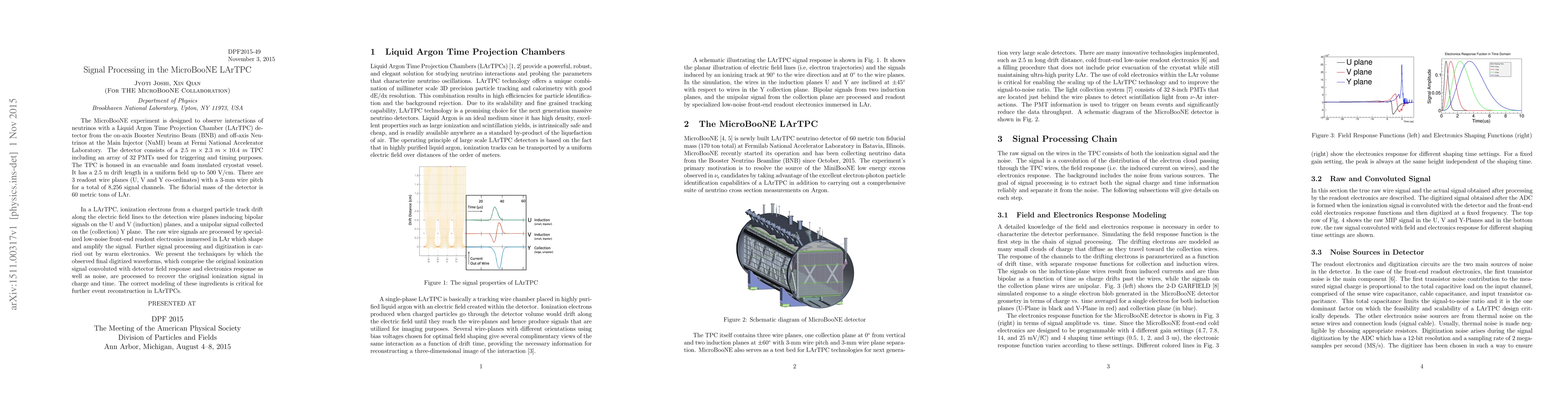The MicroBooNE experiment utilizes a Liquid Argon Time Projection Chamber (LArTPC) to detect neutrino interactions, employing sophisticated signal processing techniques to recover the original ionization signals from final digitized waveforms. Accurate modeling of detector field and electronics responses is essential for precise event reconstruction.