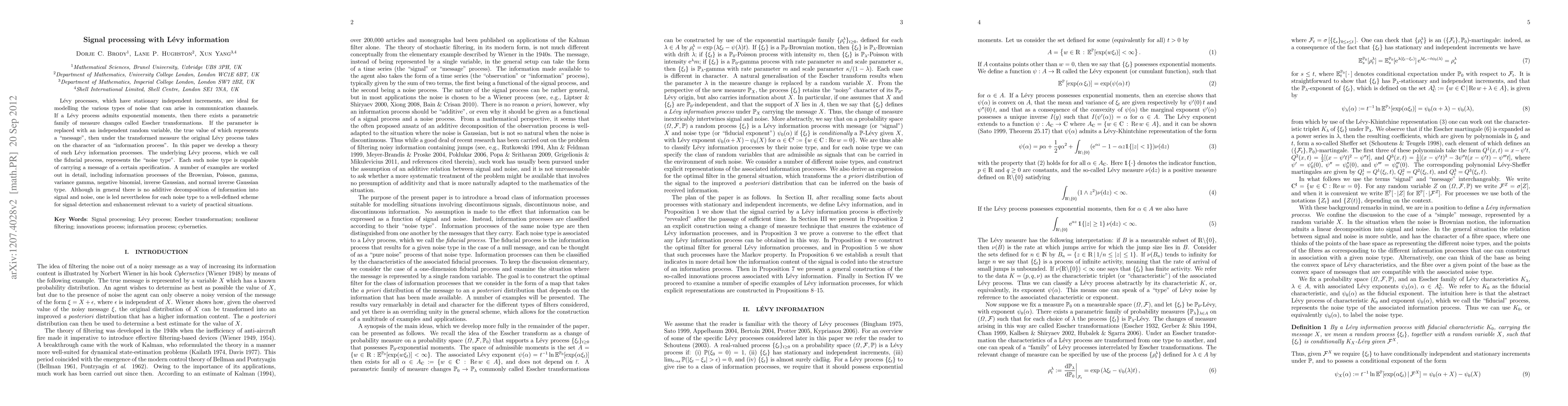 Levy processes, which have stationary independent increments, are ideal for modelling the various types of noise that can arise in communication channels. If a Levy process admits exponential moments, then there exists a parametric family of measure changes called Esscher transformations. If the parameter is replaced with an independent random variable, the true value of which represents a "message", then under the transformed measure the original Levy process takes on the character of an "information process". In this paper we develop a theory of such Levy information processes. The underlying Levy process, which we call the fiducial process, represents the "noise type". Each such noise type is capable of carrying a message of a certain specification. A number of examples are worked out in detail, including information processes of the Brownian, Poisson, gamma, variance gamma, negative binomial, inverse Gaussian, and normal inverse Gaussian type. Although in general there is no additive decomposition of information into signal and noise, one is led nevertheless for each noise type to a well-defined scheme for signal detection and enhancement relevant to a variety of practical situations.