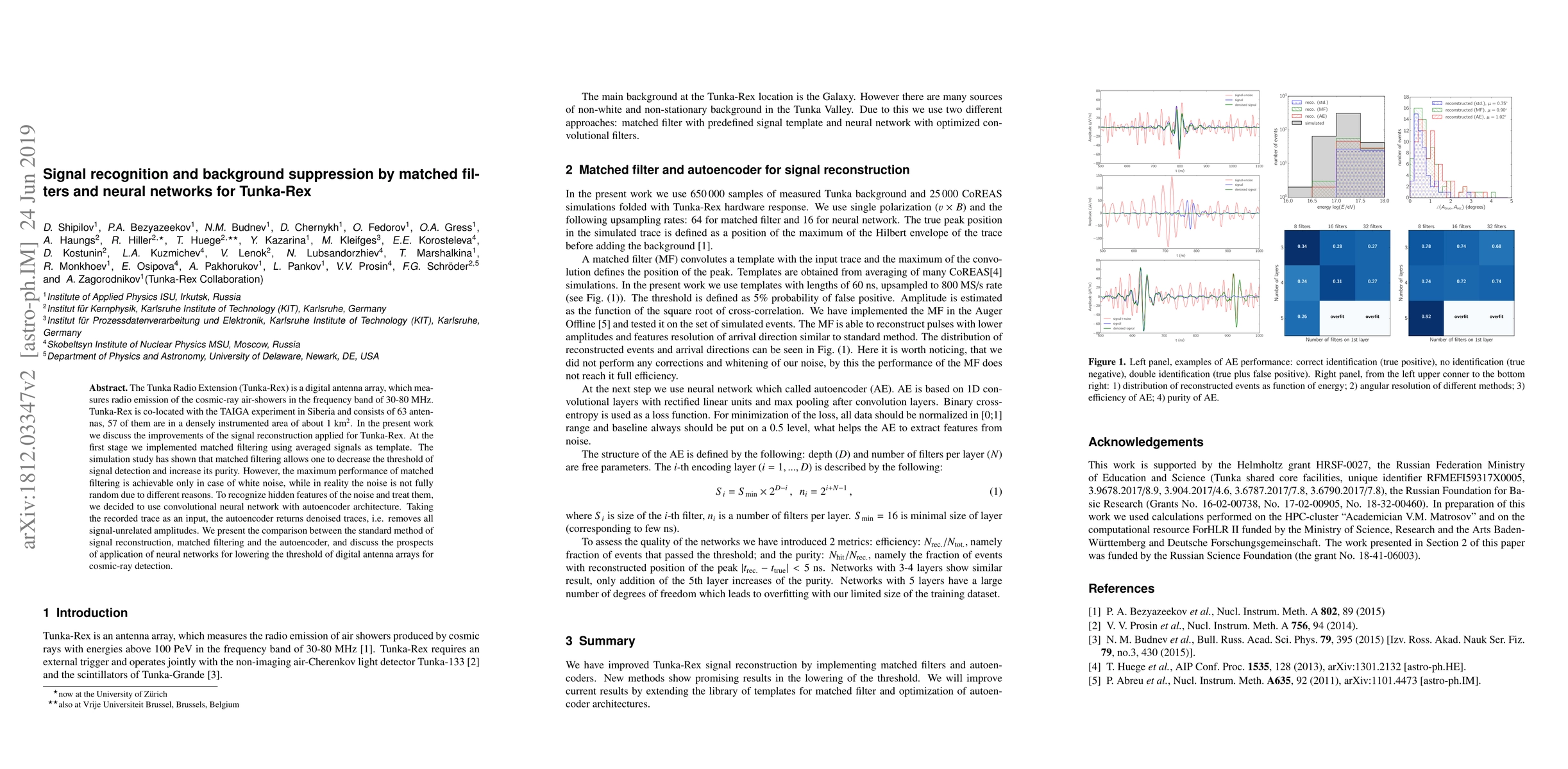 The Tunka Radio Extension (Tunka-Rex) is a digital antenna array, which measures the radio emission of the cosmic-ray air-showers in the frequency band of 30-80 MHz. Tunka-Rex is co-located with TAIGA experiment in Siberia and consists of 63 antennas, 57 of them are in a densely instrumented area of about 1 km\textsuperscript{2}. In the present work we discuss the improvements of the signal reconstruction applied for the Tunka-Rex. At the first stage we implemented matched filtering using averaged signals as template. The simulation study has shown that matched filtering allows one to decrease the threshold of signal detection and increase its purity. However, the maximum performance of matched filtering is achievable only in case of white noise, while in reality the noise is not fully random due to different reasons. To recognize hidden features of the noise and treat them, we decided to use convolutional neural network with autoencoder architecture. Taking the recorded trace as an input, the autoencoder returns denoised trace, i.e. removes all signal-unrelated amplitudes. We present the comparison between standard method of signal reconstruction, matched filtering and autoencoder, and discuss the prospects of application of neural networks for lowering the threshold of digital antenna arrays for cosmic-ray detection.
