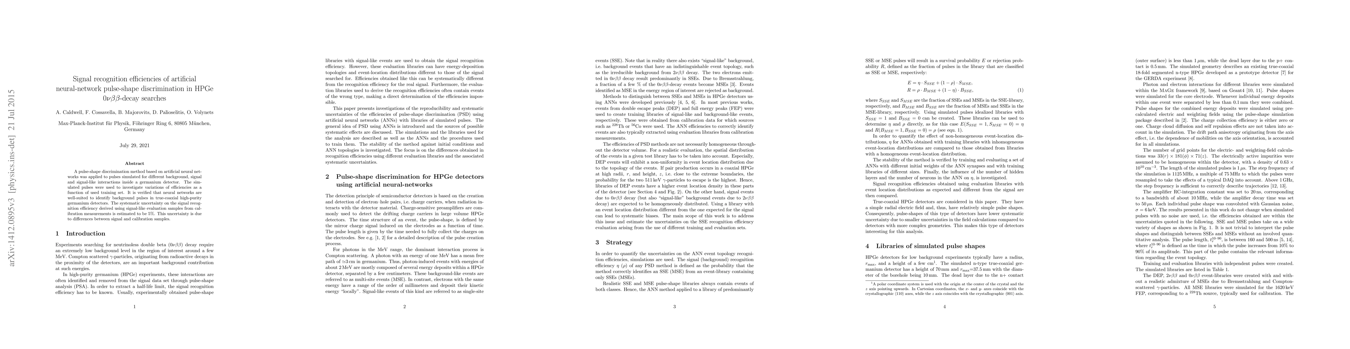 A pulse-shape discrimination method based on artificial neural networks was applied to pulses simulated for different background, signal and signal-like interactions inside a germanium detector. The simulated pulses were used to investigate variations of efficiencies as a function of used training set. It is verified that neural networks are well-suited to identify background pulses in true-coaxial high-purity germanium detectors. The systematic uncertainty on the signal recognition efficiency derived using signal-like evaluation samples from calibration measurements is estimated to be 5\%. This uncertainty is due to differences between signal and calibration samples.