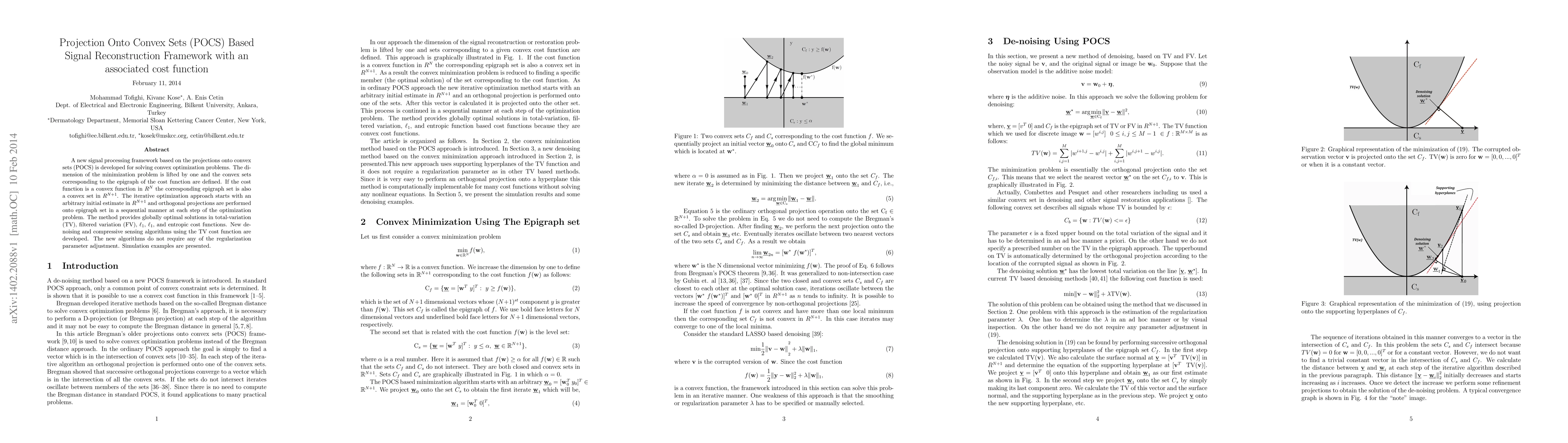 A new signal processing framework based on making orthogonal Projections onto the Epigraph Set of a Convex cost function (PESC) is developed. In this way it is possible to solve convex optimization problems using the well-known Projections onto Convex Set (POCS) approach. In this algorithm, the dimension of the minimization problem is lifted by one and a convex set corresponding to the epigraph of the cost function is defined. If the cost function is a convex function in $R^N$, the corresponding epigraph set is also a convex set in R^{N+1}. The PESC method provides globally optimal solutions for total-variation (TV), filtered variation (FV), L_1, L_2, and entropic cost function based convex optimization problems. In this article, the PESC based denoising and compressive sensing algorithms are developed. Simulation examples are presented.