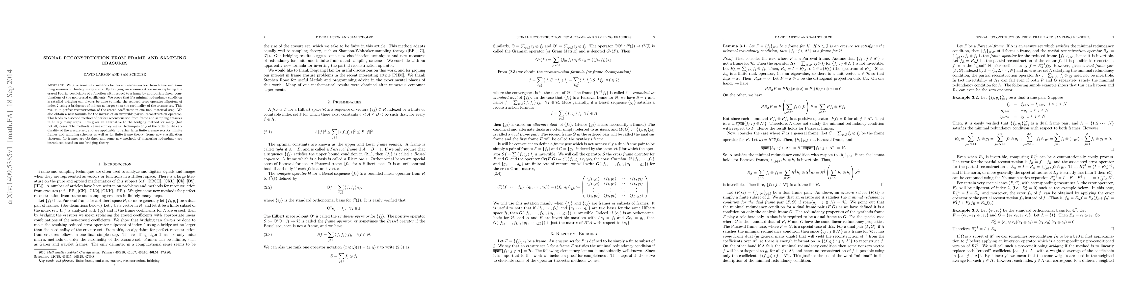 Researchers develop new methods to reconstruct signals with frame and sampling erasures in a limited number of steps, using techniques that apply to large finite sets and infinite frames.