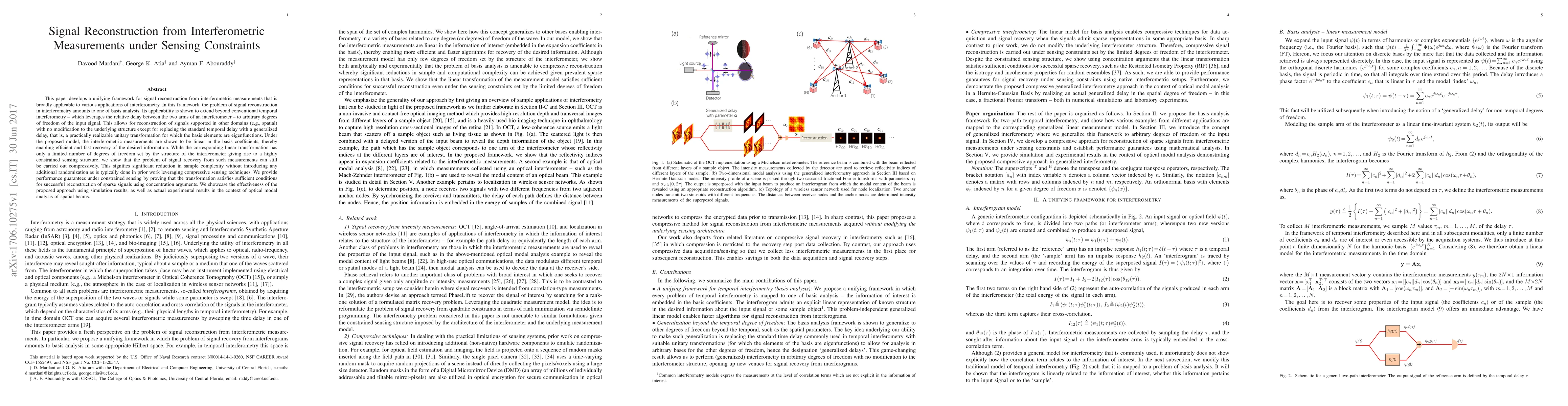 This paper develops a unifying framework for signal reconstruction from interferometric measurements that is broadly applicable to various applications of interferometry. In this framework, the problem of signal reconstruction in interferometry amounts to one of basis analysis. Its applicability is shown to extend beyond conventional temporal interferometry, which leverages the relative delay between the two arms of an interferometer, to arbitrary degrees of freedom of the input signal. This allows for reconstruction of signals supported in other domains (e.g., spatial) with no modification to the underlying structure except for replacing the standard temporal delay with a generalized delay, that is, a practically realizable unitary transformation for which the basis elements are eigenfunctions. Under the proposed model, the interferometric measurements are shown to be linear in the basis coefficients, thereby enabling efficient and fast recovery of the desired information. While the corresponding linear transformation has only a limited number of degrees of freedom set by the structure of the interferometer giving rise to a highly constrained sensing structure, we show that the problem of signal recovery from such measurements can still be carried out compressively. This signifies significant reduction in sample complexity without introducing any additional randomization as is typically done in prior work leveraging compressive sensing techniques. We provide performance guarantees under constrained sensing by proving that the transformation satisfies sufficient conditions for successful reconstruction of sparse signals using concentration arguments. We showcase the effectiveness of the proposed approach using simulation results, as well as actual experimental results in the context of optical modal analysis of spatial beams.