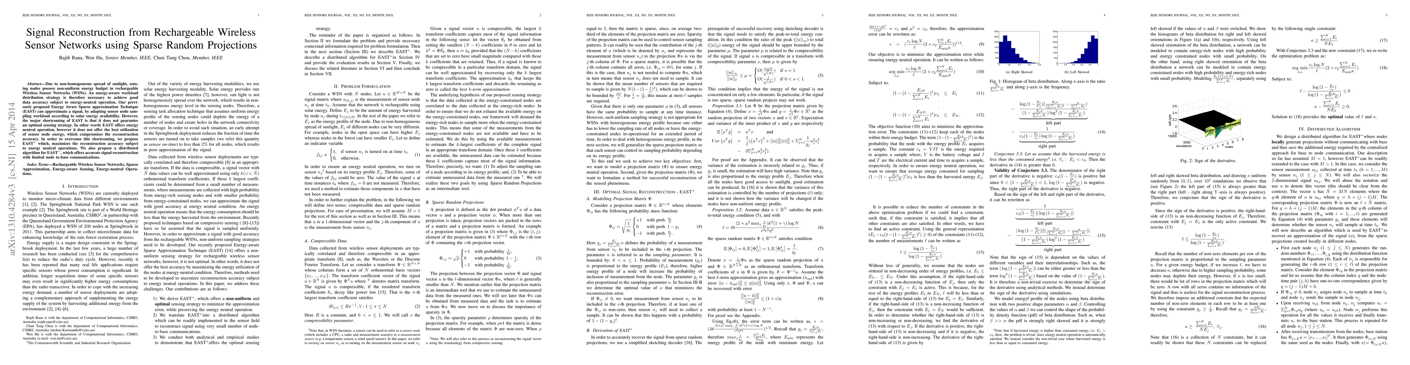 This paper proposes EAST, an energy-aware technique for signal reconstruction in rechargeable wireless sensor networks by adapting sensor sampling based on solar energy availability. An improved version, EAST+, optimizes the number of measurements based on the energy budget without requiring prior knowledge of approximation error.