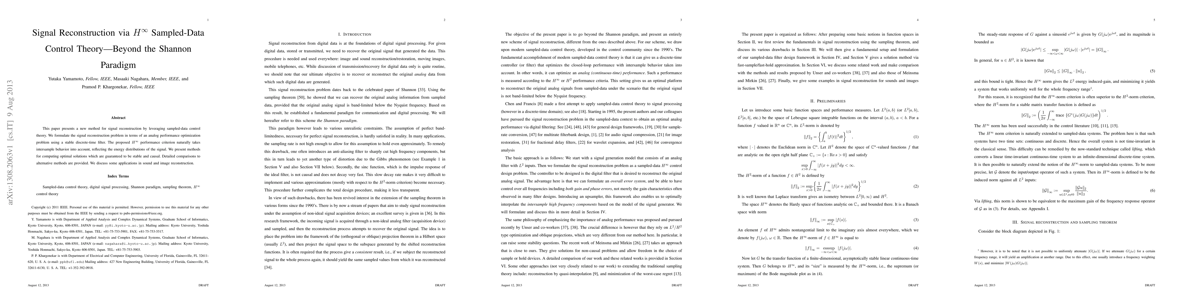 The paper presents a new method for signal reconstruction using sampled-data control theory, formulated as an analog performance optimization problem with a stable discrete-time filter. It introduces an H-infinity performance criterion to account for intersample behavior, ensuring stable and causal optimal solutions.