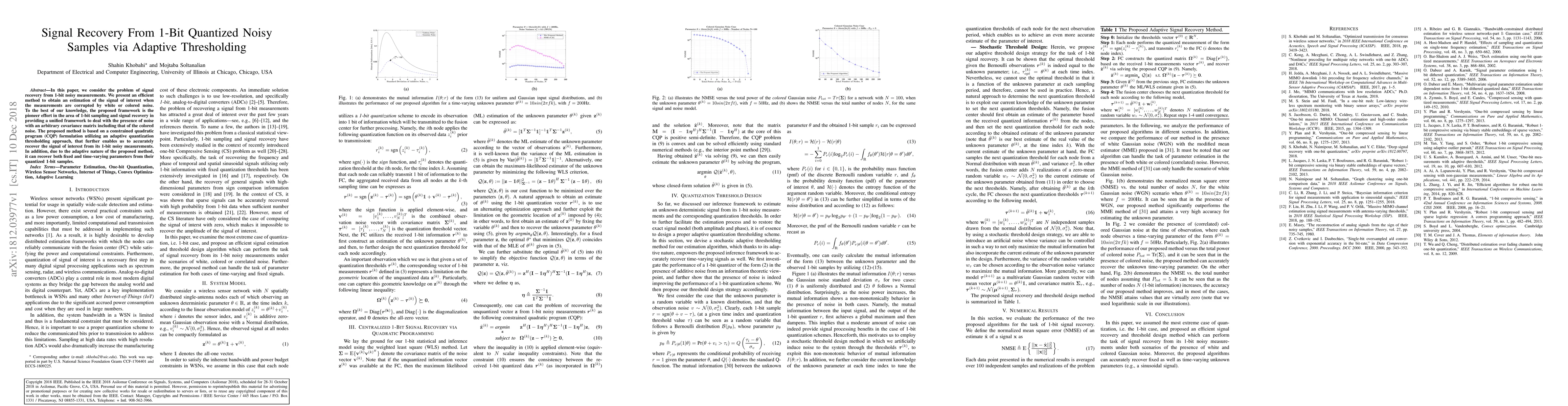 In this paper, we consider the problem of signal recovery from 1-bit noisy measurements. We present an efficient method to obtain an estimation of the signal of interest when the measurements are corrupted by white or colored noise. To the best of our knowledge, the proposed framework is the pioneer effort in the area of 1-bit sampling and signal recovery in providing a unified framework to deal with the presence of noise with an arbitrary covariance matrix including that of the colored noise. The proposed method is based on a constrained quadratic program (CQP) formulation utilizing an adaptive quantization thresholding approach, that further enables us to accurately recover the signal of interest from its 1-bit noisy measurements. In addition, due to the adaptive nature of the proposed method, it can recover both fixed and time-varying parameters from their quantized 1-bit samples.