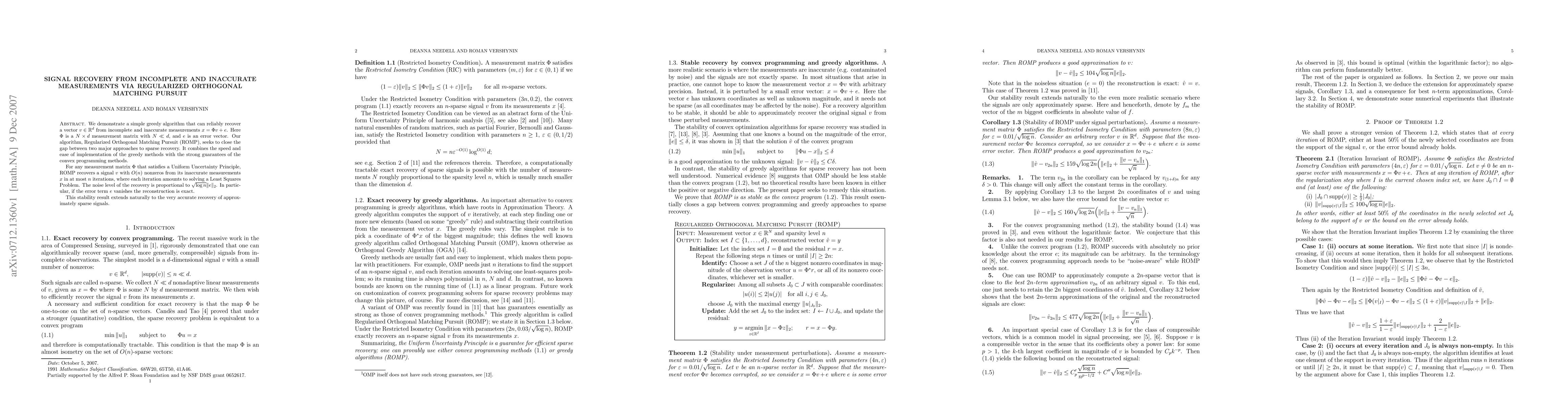 We demonstrate a simple greedy algorithm that can reliably recover a d-dimensional vector v from incomplete and inaccurate measurements x. Here our measurement matrix is an N by d matrix with N much smaller than d. Our algorithm, Regularized Orthogonal Matching Pursuit (ROMP), seeks to close the gap between two major approaches to sparse recovery. It combines the speed and ease of implementation of the greedy methods with the strong guarantees of the convex programming methods. For any measurement matrix that satisfies a Uniform Uncertainty Principle, ROMP recovers a signal with O(n) nonzeros from its inaccurate measurements x in at most n iterations, where each iteration amounts to solving a Least Squares Problem. The noise level of the recovery is proportional to the norm of the error, up to a log factor. In particular, if the error vanishes the reconstruction is exact. This stability result extends naturally to the very accurate recovery of approximately sparse signals.