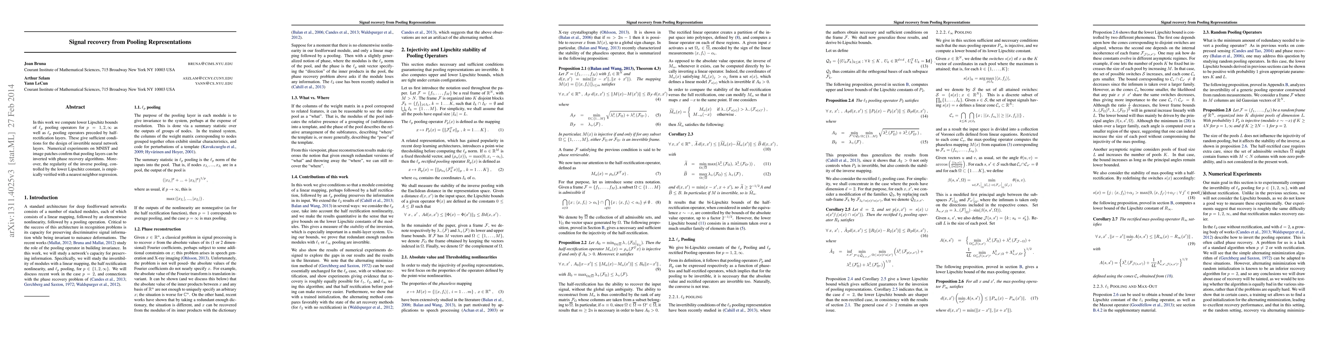 In this work we compute lower Lipschitz bounds of $\ell_p$ pooling operators for $p=1, 2, \infty$ as well as $\ell_p$ pooling operators preceded by half-rectification layers. These give sufficient conditions for the design of invertible neural network layers. Numerical experiments on MNIST and image patches confirm that pooling layers can be inverted with phase recovery algorithms. Moreover, the regularity of the inverse pooling, controlled by the lower Lipschitz constant, is empirically verified with a nearest neighbor regression.