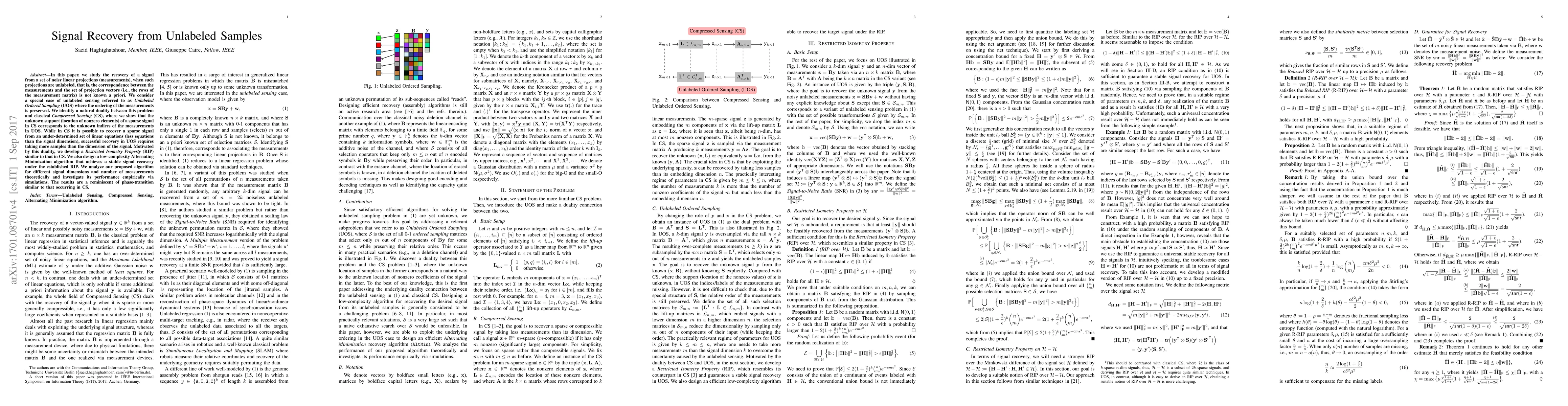 Researchers developed a method to recover signals from noisy linear projections without knowing the original signal, building on the connection between Unlabeled Ordered Sampling and Compressed Sensing.