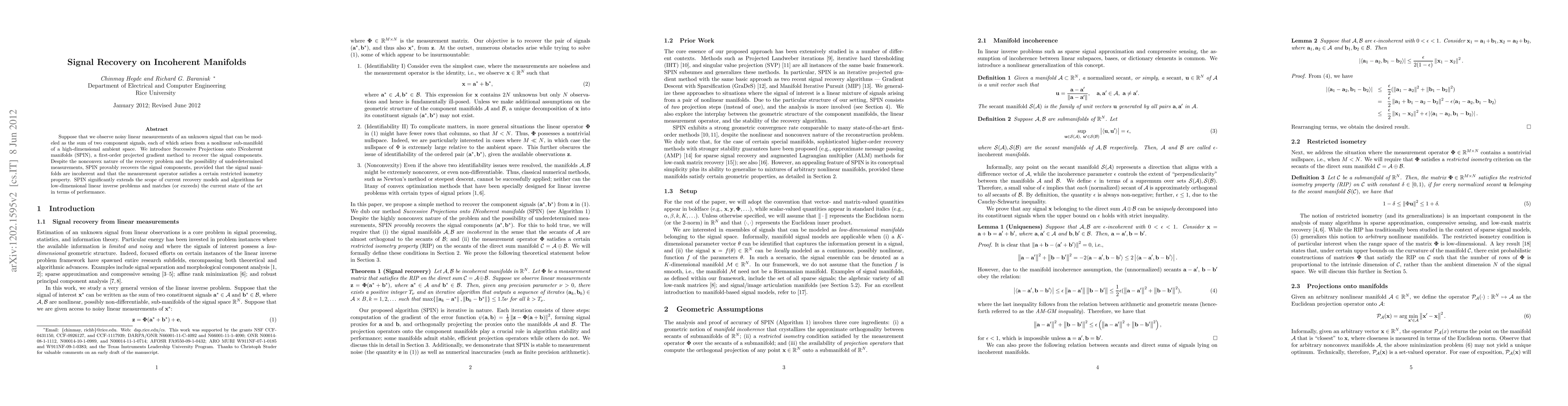 Suppose that we observe noisy linear measurements of an unknown signal that can be modeled as the sum of two component signals, each of which arises from a nonlinear sub-manifold of a high dimensional ambient space. We introduce SPIN, a first order projected gradient method to recover the signal components. Despite the nonconvex nature of the recovery problem and the possibility of underdetermined measurements, SPIN provably recovers the signal components, provided that the signal manifolds are incoherent and that the measurement operator satisfies a certain restricted isometry property. SPIN significantly extends the scope of current recovery models and algorithms for low dimensional linear inverse problems and matches (or exceeds) the current state of the art in terms of performance.