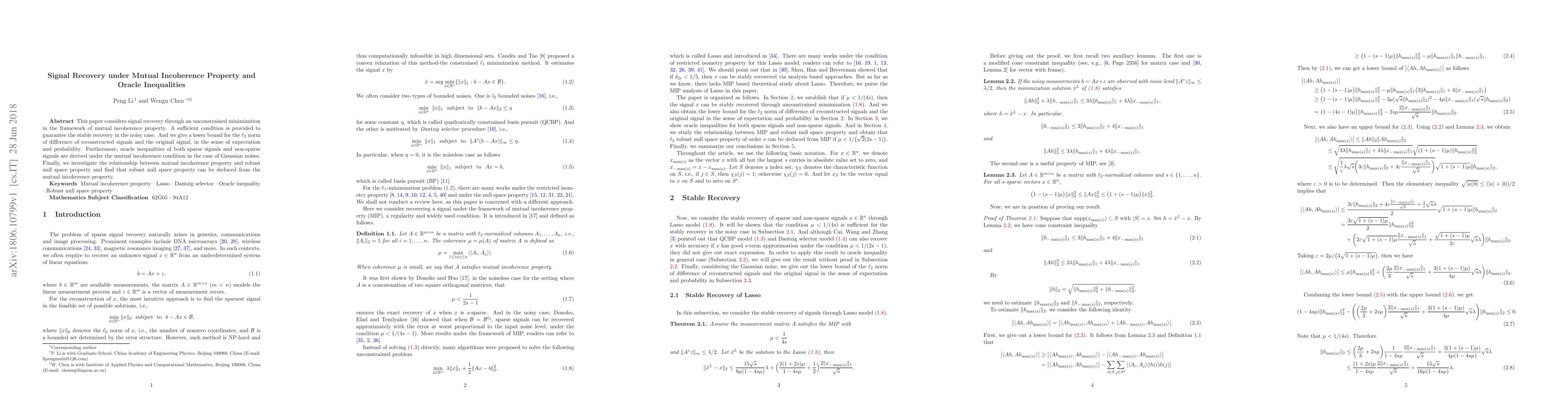 This paper explores signal recovery via unconstrained minimization under the mutual incoherence property, providing a sufficient condition for stable recovery in noisy scenarios. It also derives oracle inequalities for both sparse and non-sparse signals under Gaussian noise and establishes a connection between mutual incoherence and robust null space properties.
