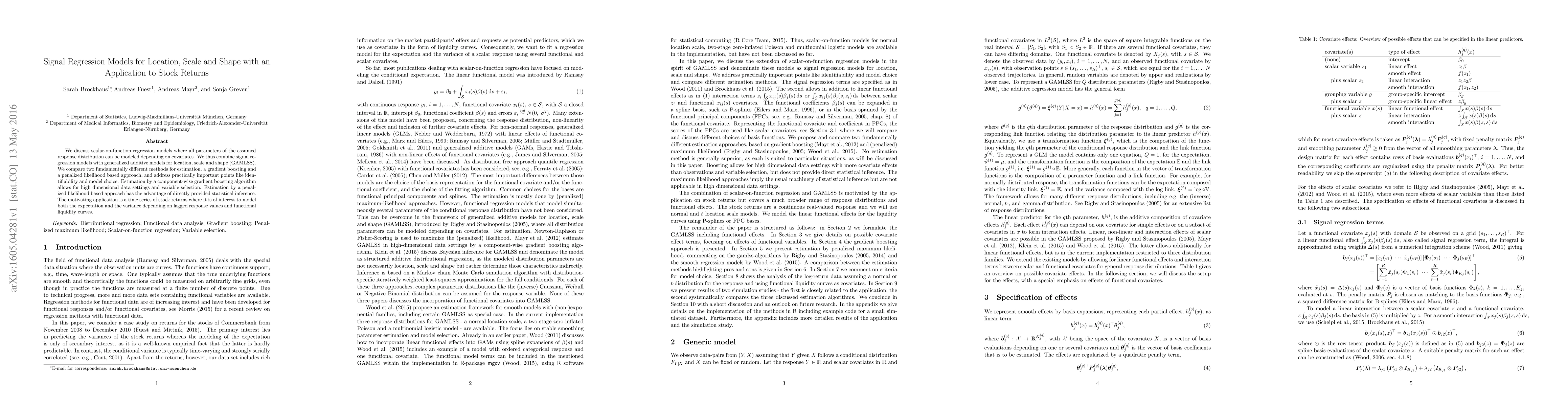 This paper proposes scalar-on-function regression models combining signal regression with GAMLSS to model location, scale, and shape of stock returns. It compares gradient boosting and penalized likelihood methods for estimation, highlighting advantages like variable selection and direct statistical inference, respectively.