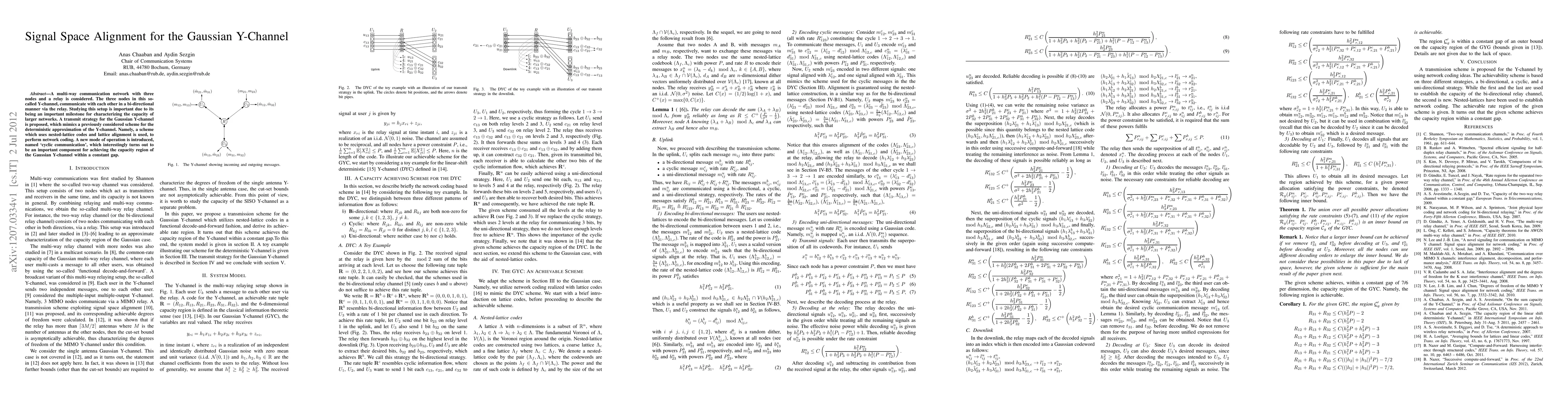 A multi-way communication network with three nodes and a relay is considered. The three nodes in this so-called Y-channel, communicate with each other in a bi-directional manner via the relay. Studying this setup is important due to its being an important milestone for characterizing the capacity of larger networks. A transmit strategy for the Gaussian Y-channel is proposed, which mimics a previously considered scheme for the deterministic approximation of the Y-channel. Namely, a scheme which uses nested-lattice codes and lattice alignment is used, to perform network coding. A new mode of operation is introduced, named `cyclic communication', which interestingly turns out to be an important component for achieving the capacity region of the Gaussian Y-channel within a constant gap.