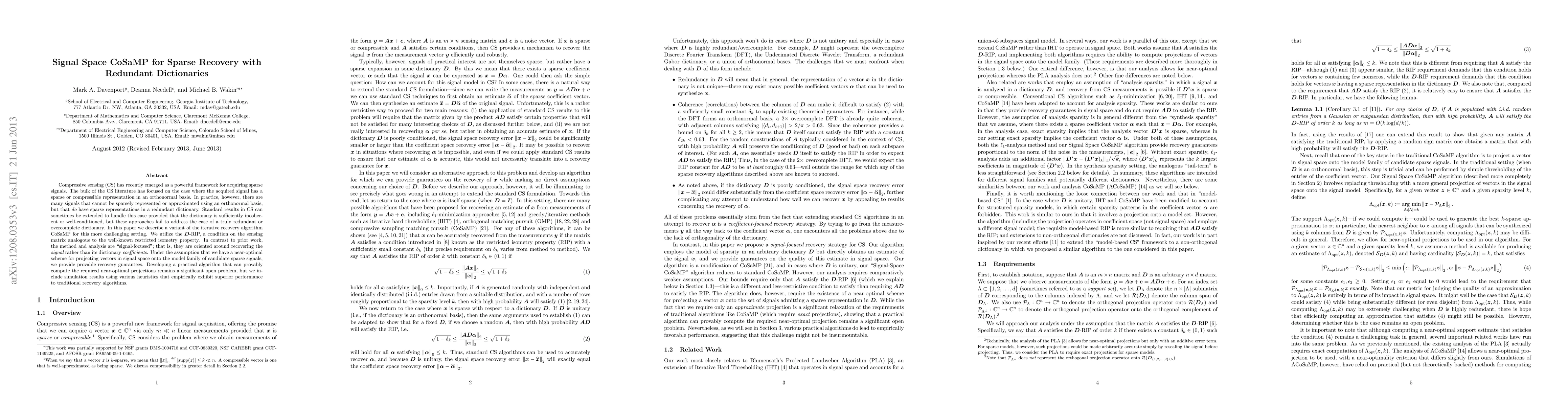 This paper proposes a variant of the CoSaMP algorithm for sparse signal recovery using redundant dictionaries, focusing on signal recovery rather than dictionary coefficients. It introduces the D-RIP condition for the sensing matrix and provides theoretical recovery guarantees under certain assumptions, while simulation results show improved performance over traditional methods.