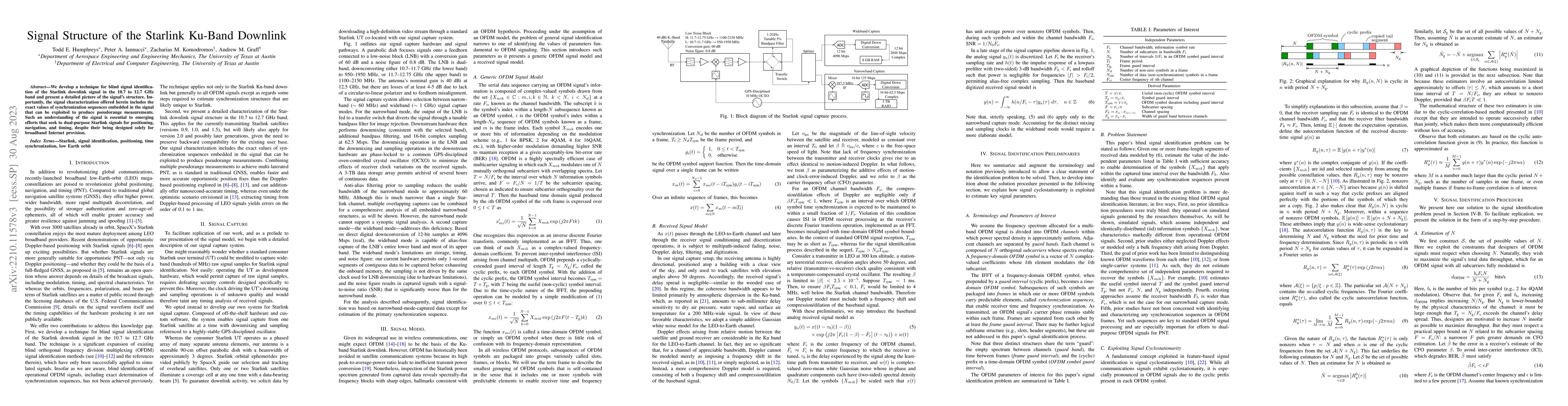 This paper introduces a novel method for identifying the Starlink Ku-band downlink signal in the 10.7 to 12.7 GHz range and provides a detailed analysis of its structure, including precise synchronization sequences. This characterization is vital for leveraging Starlink signals for positioning, navigation, and timing applications.