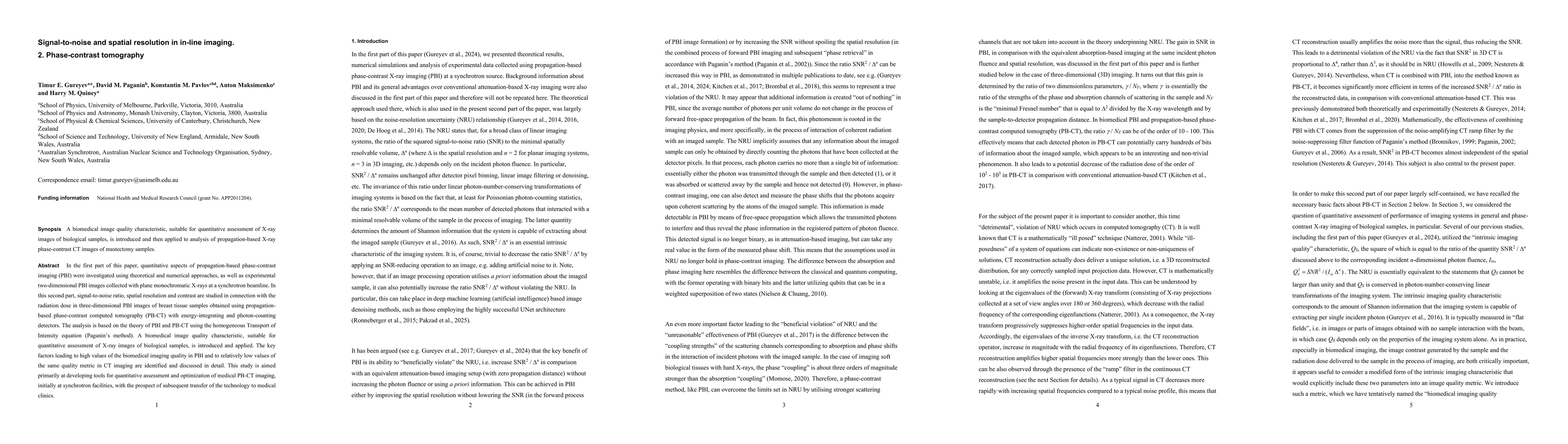 In the first part of this paper, quantitative aspects of propagation-based phase-contrast imaging (PBI) were investigated using theoretical and numerical approaches, as well as experimental two-dimensional PBI images collected with plane monochromatic X-rays at a synchrotron beamline. In this second part, signal-to-noise ratio, spatial resolution and contrast are studied in connection with the radiation dose in three-dimensional PBI images of breast tissue samples obtained using propagation-based phase-contrast computed tomography (PB-CT) with energy-integrating and photon-counting detectors. The analysis is based on the theory of PBI and PB-CT using the homogeneous Transport of Intensity equation (Paganin's method). A biomedical image quality characteristic, suitable for quantitative assessment of X-ray images of biological samples, is introduced and applied. The key factors leading to high values of the biomedical imaging quality in PBI and to relatively low values of the same quality metric in CT imaging are identified and discussed in detail. This study is aimed primarily at developing tools for quantitative assessment and optimization of medical PB-CT imaging, initially at synchrotron facilities, with the prospect of subsequent transfer of the technology to medical clinics.