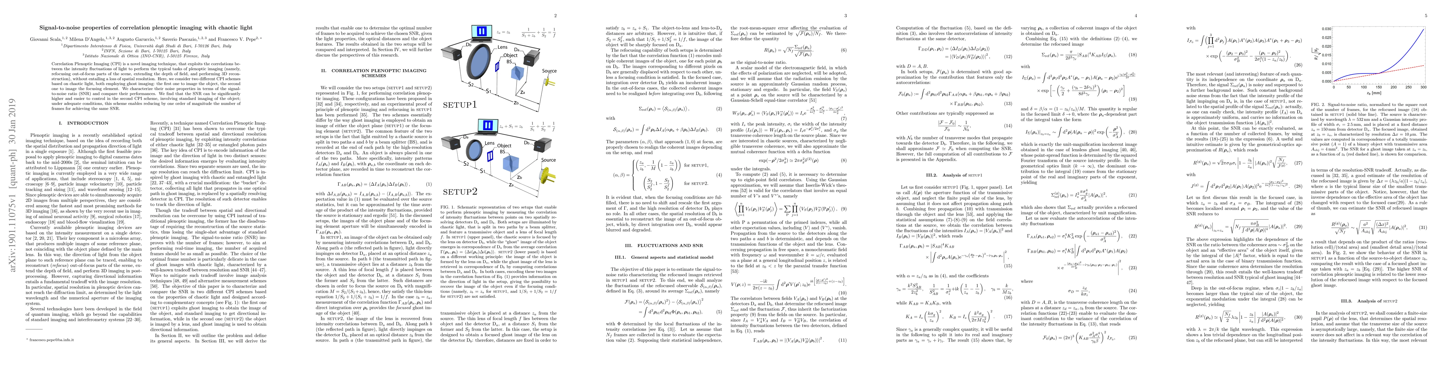 The research employs correlation plenoptic imaging (CPI) with chaotic light, analyzing two distinct CPI schemes for imaging an object and a focusing element, focusing on their signal-to-noise ratio (SNR) properties.